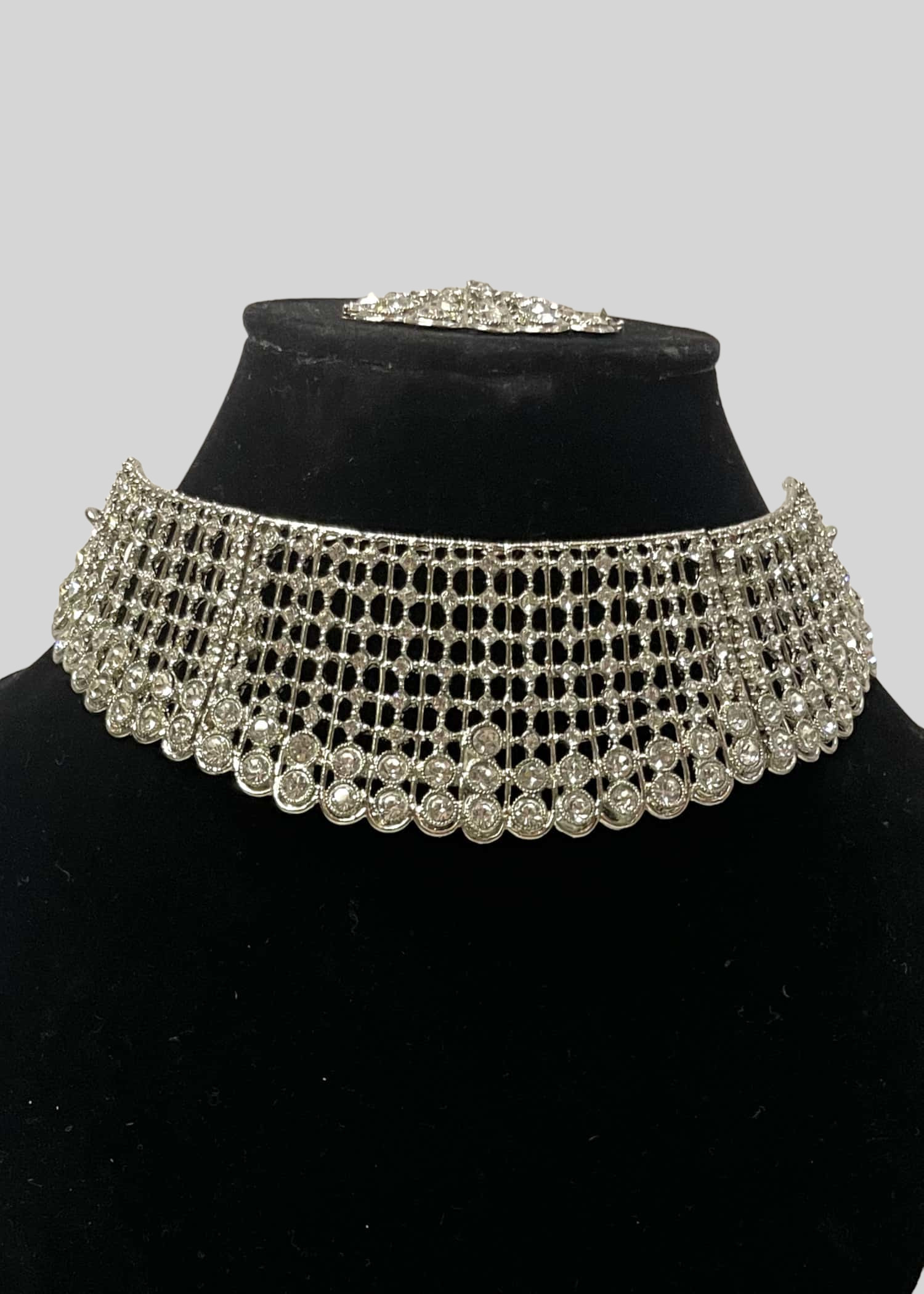 1 choker necklace, 1 maang tikka and a pair of ear rings