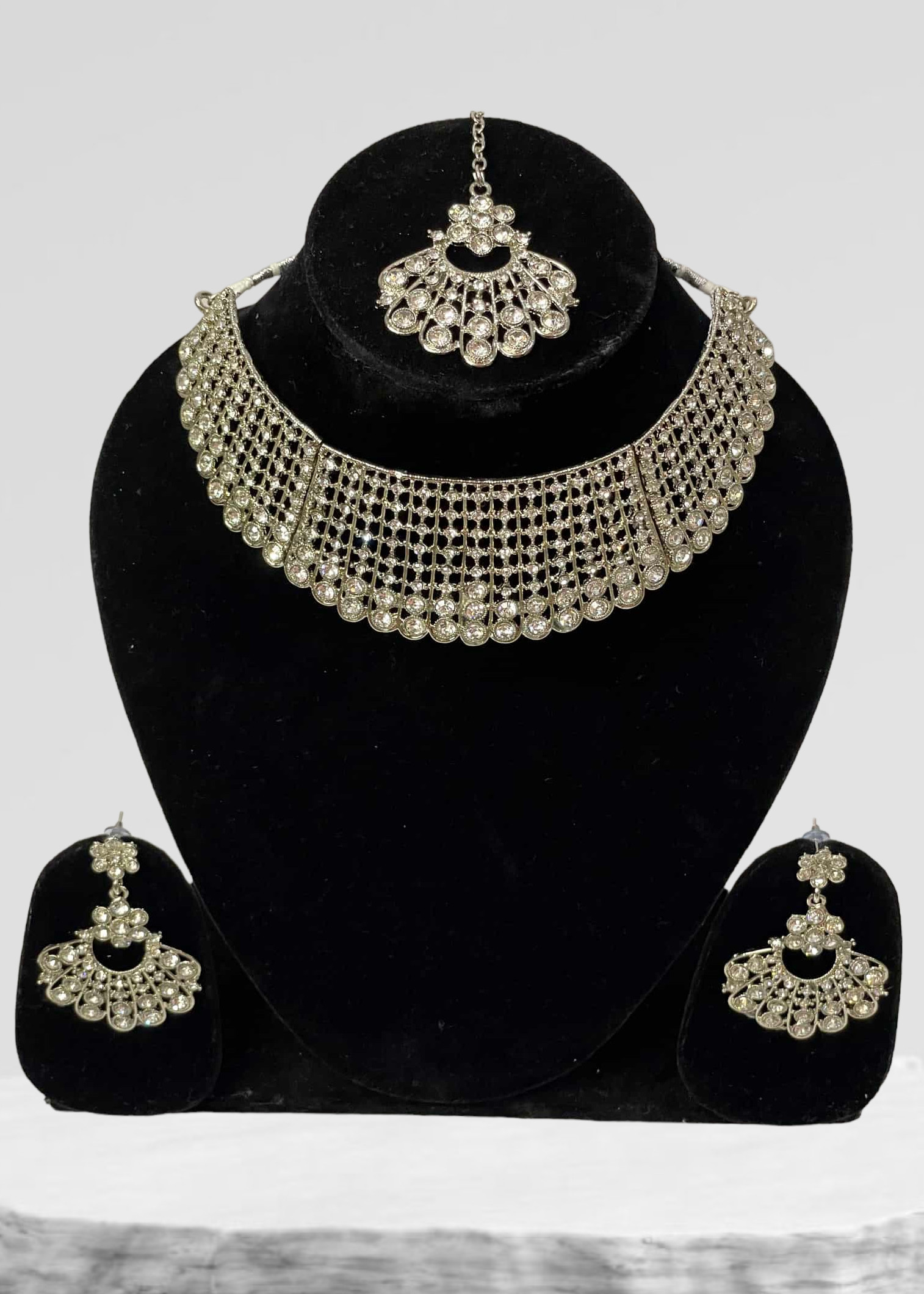 - Set includes a choker necklace, earrings, and maang tikka for a complete look