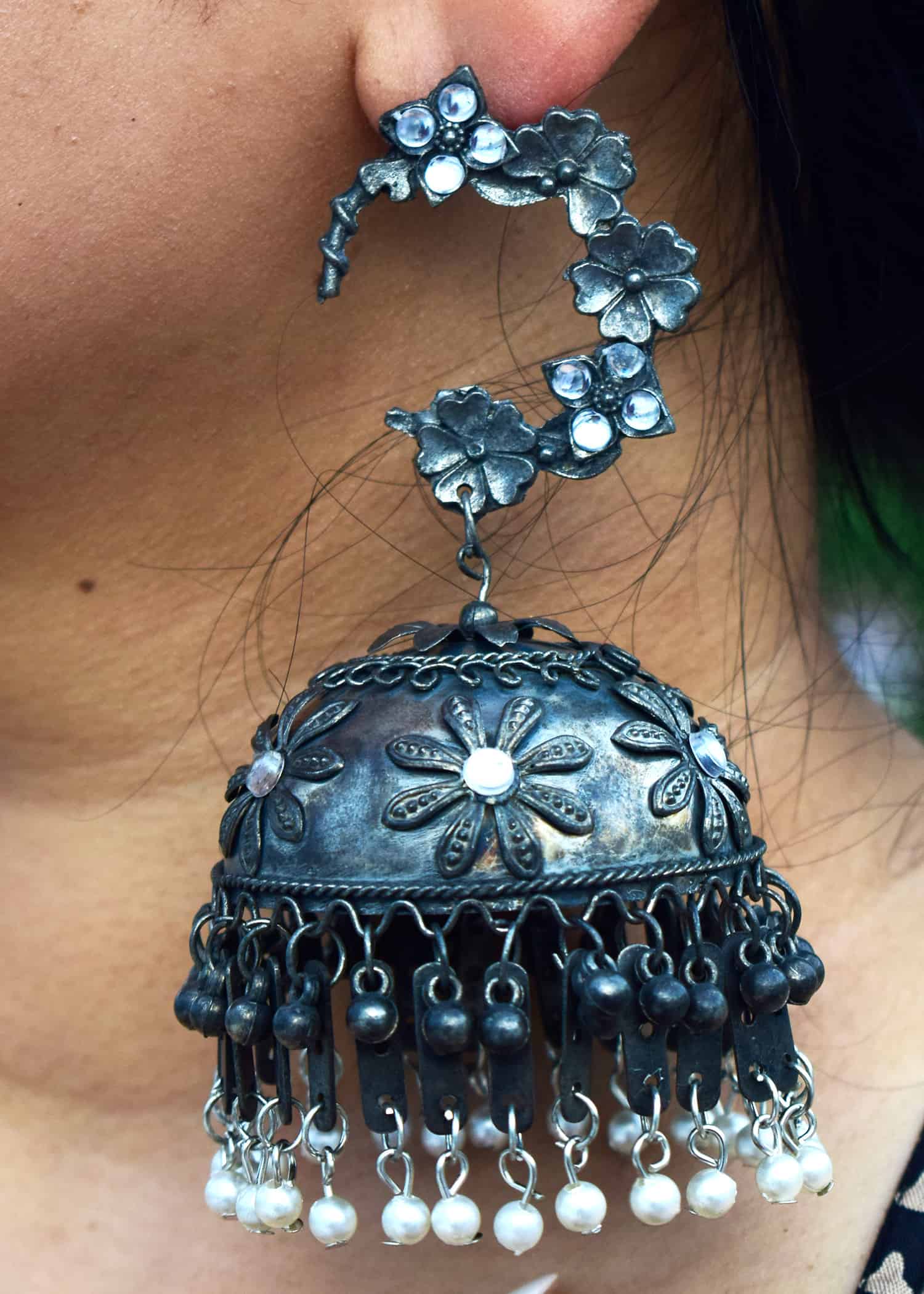 Crafted with precision and passion, these earrings feature an oxidized metal hemisphere with intricate metal work and adorned with artificial pearls. The beautiful metal work on these earrings showcases one of the finest works of oxidized jewellery, which gives them an antique look. The oxidized finish is achieved by introducing the jewellery to chemicals over a long period of time, which changes the surface color and gives them a unique appearance.