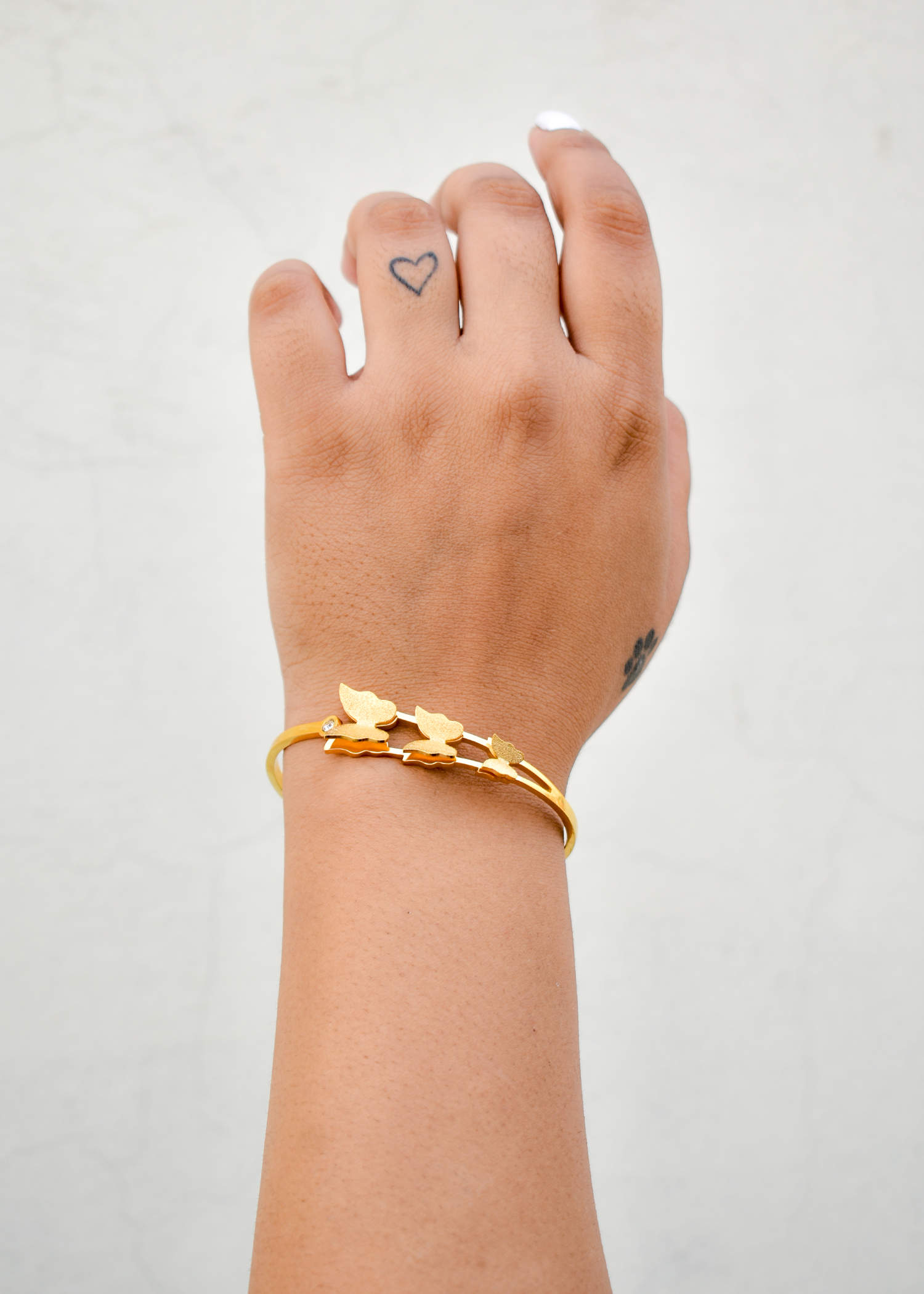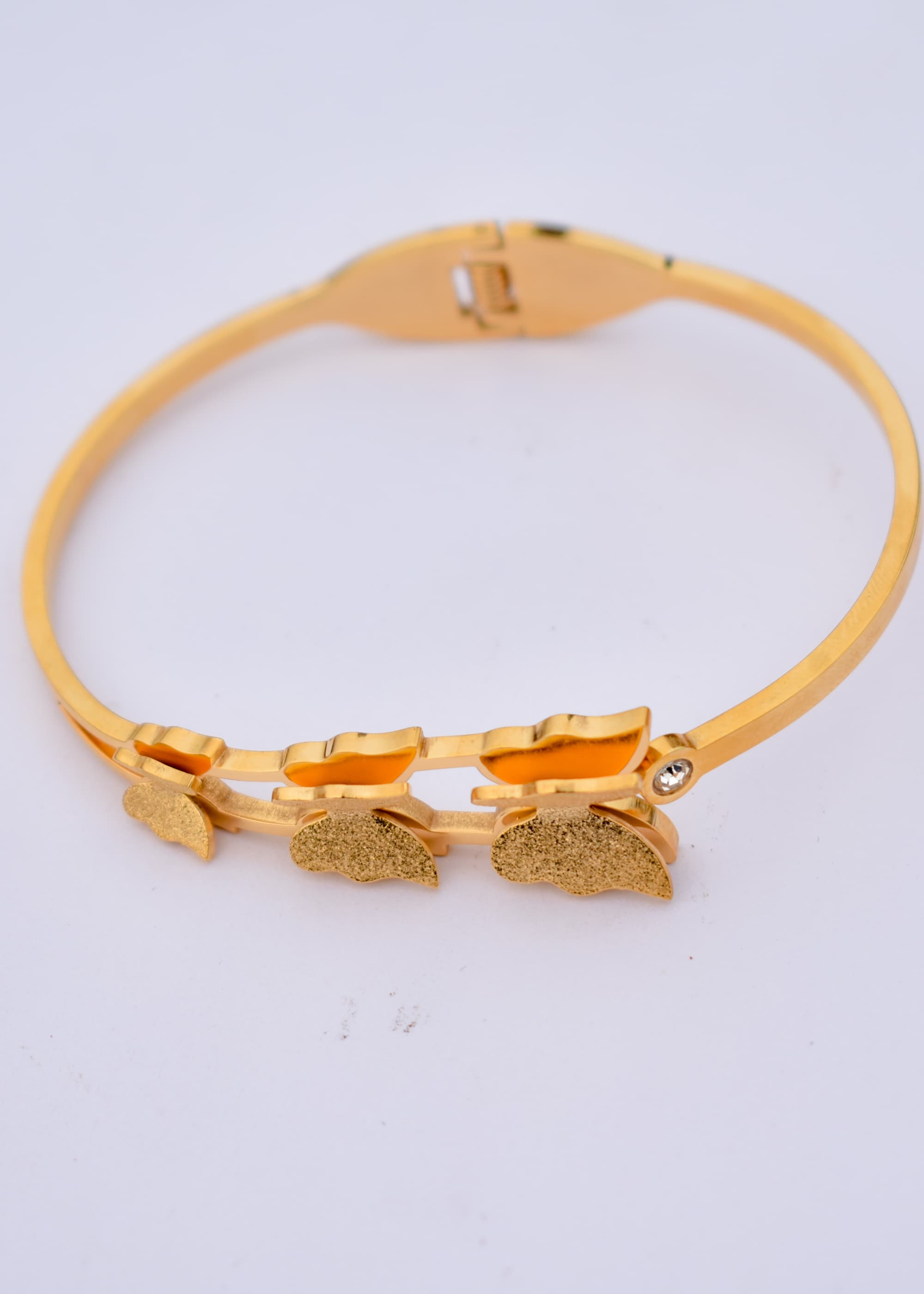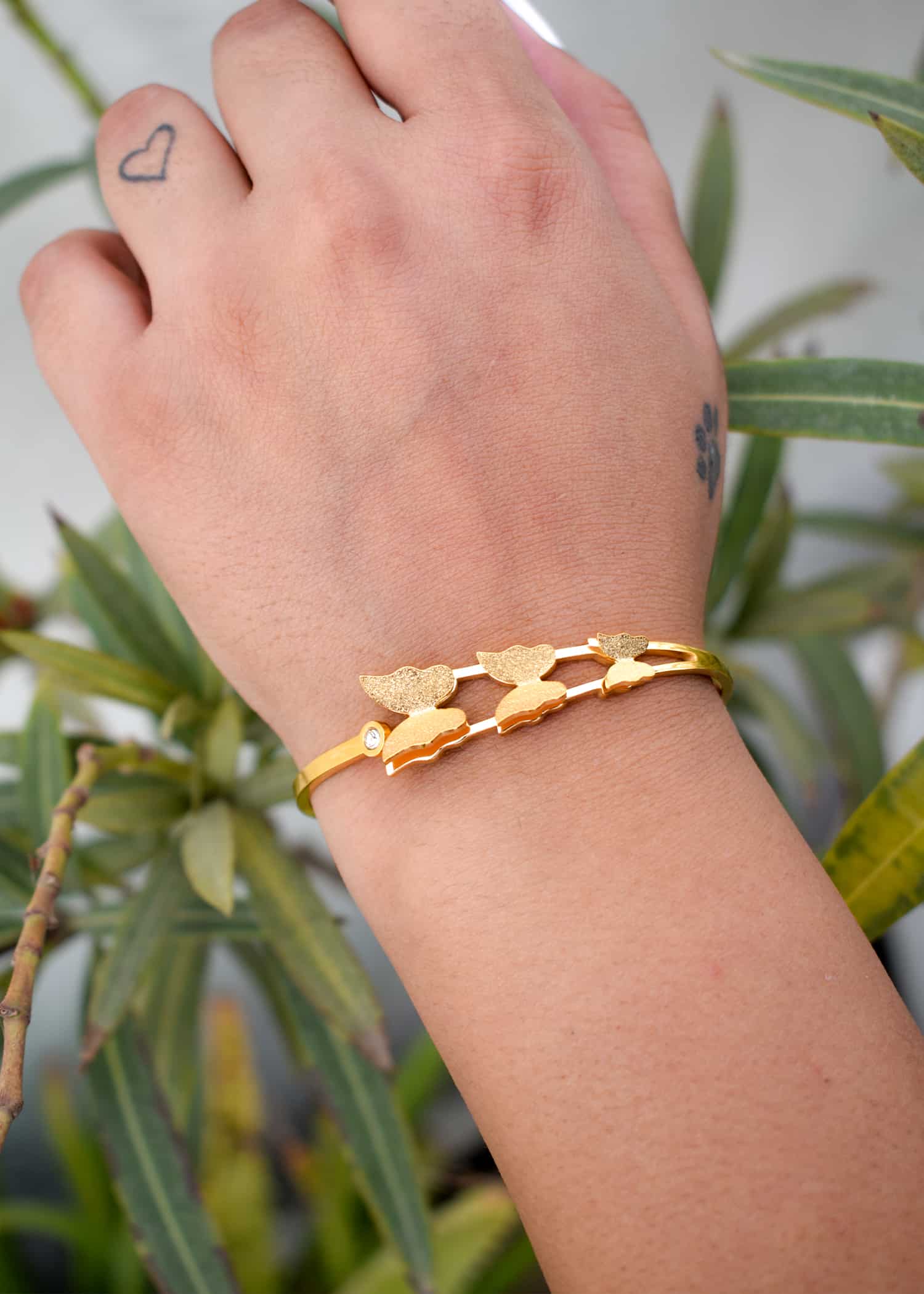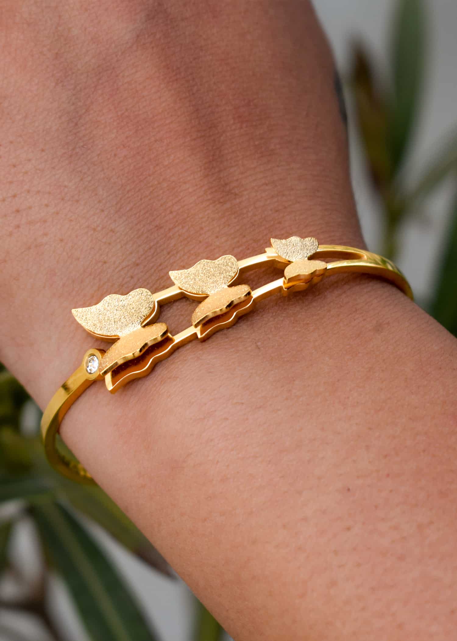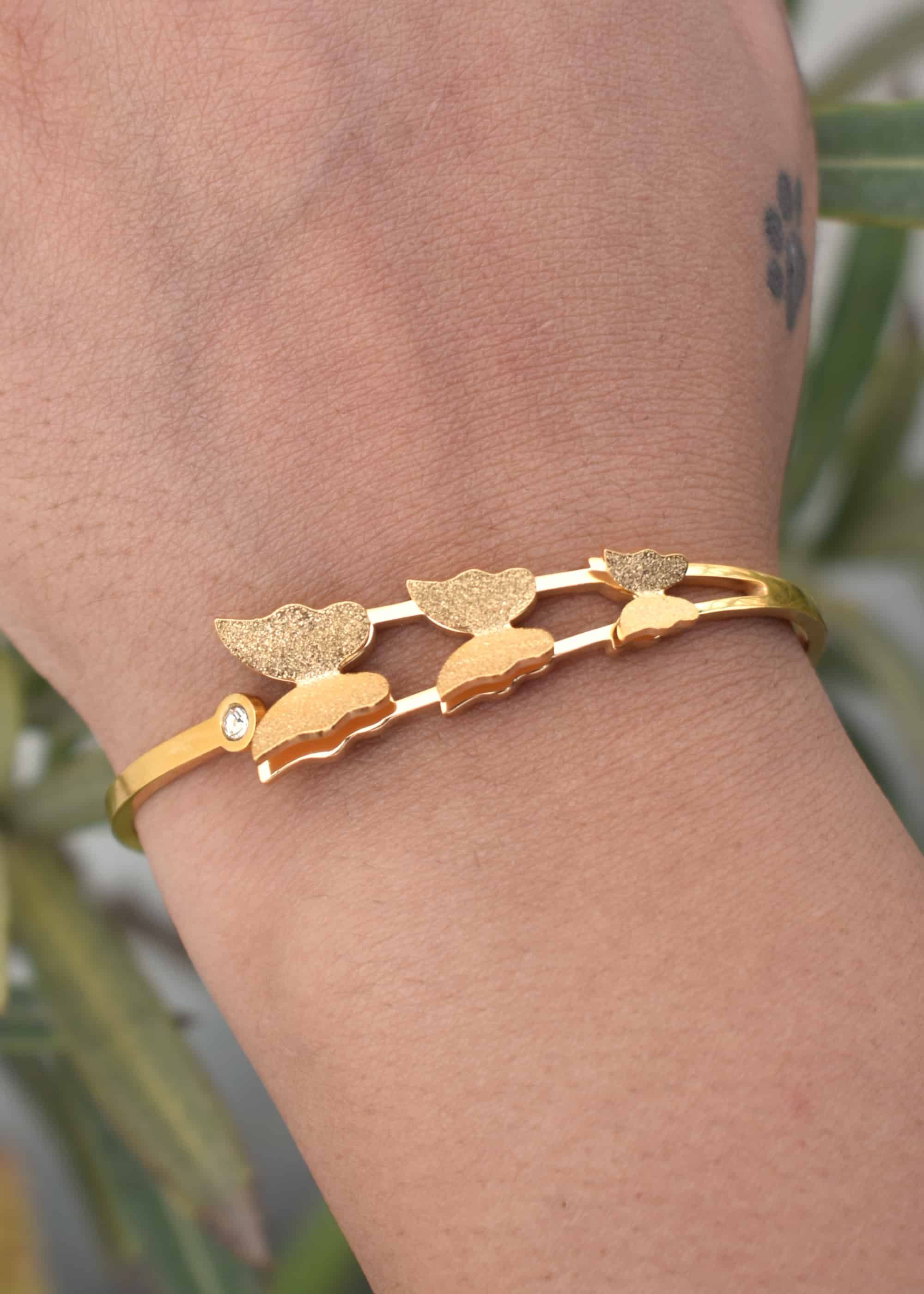 At the center of the bracelet is finely detailed butterflies, carefully crafted to capture the essence of these enchanting creatures. The golden-plated metal gives a luxurious shine to the butterfly’s wings, making this piece radiate both elegance and strength.