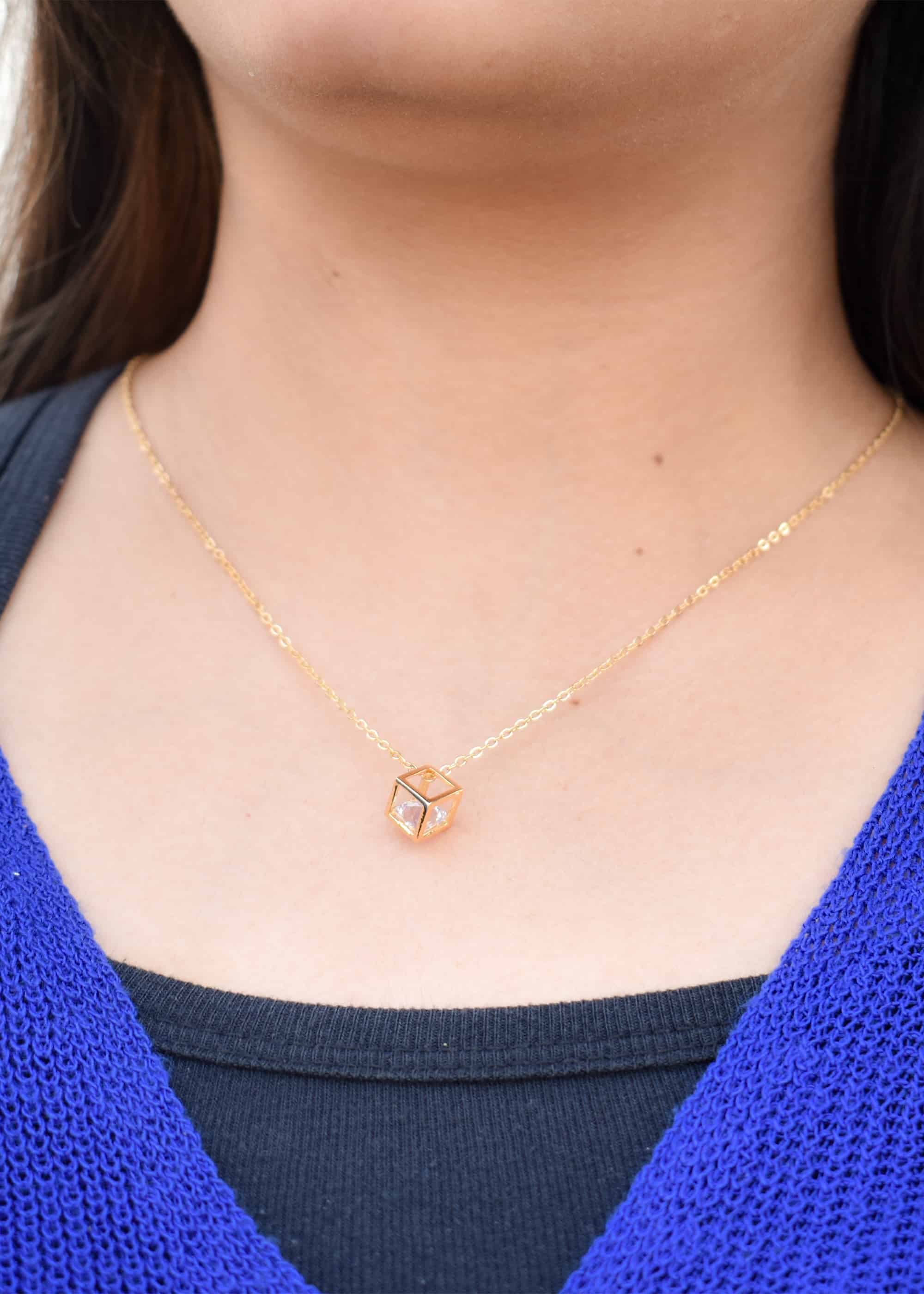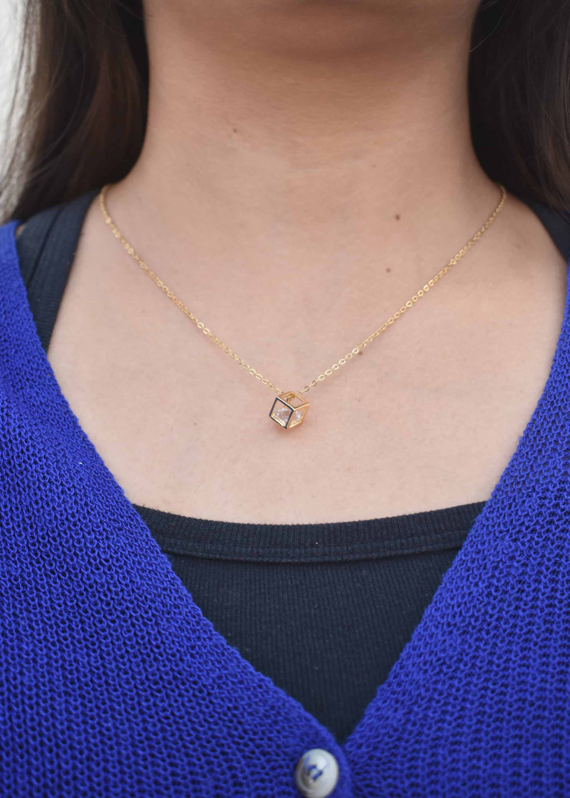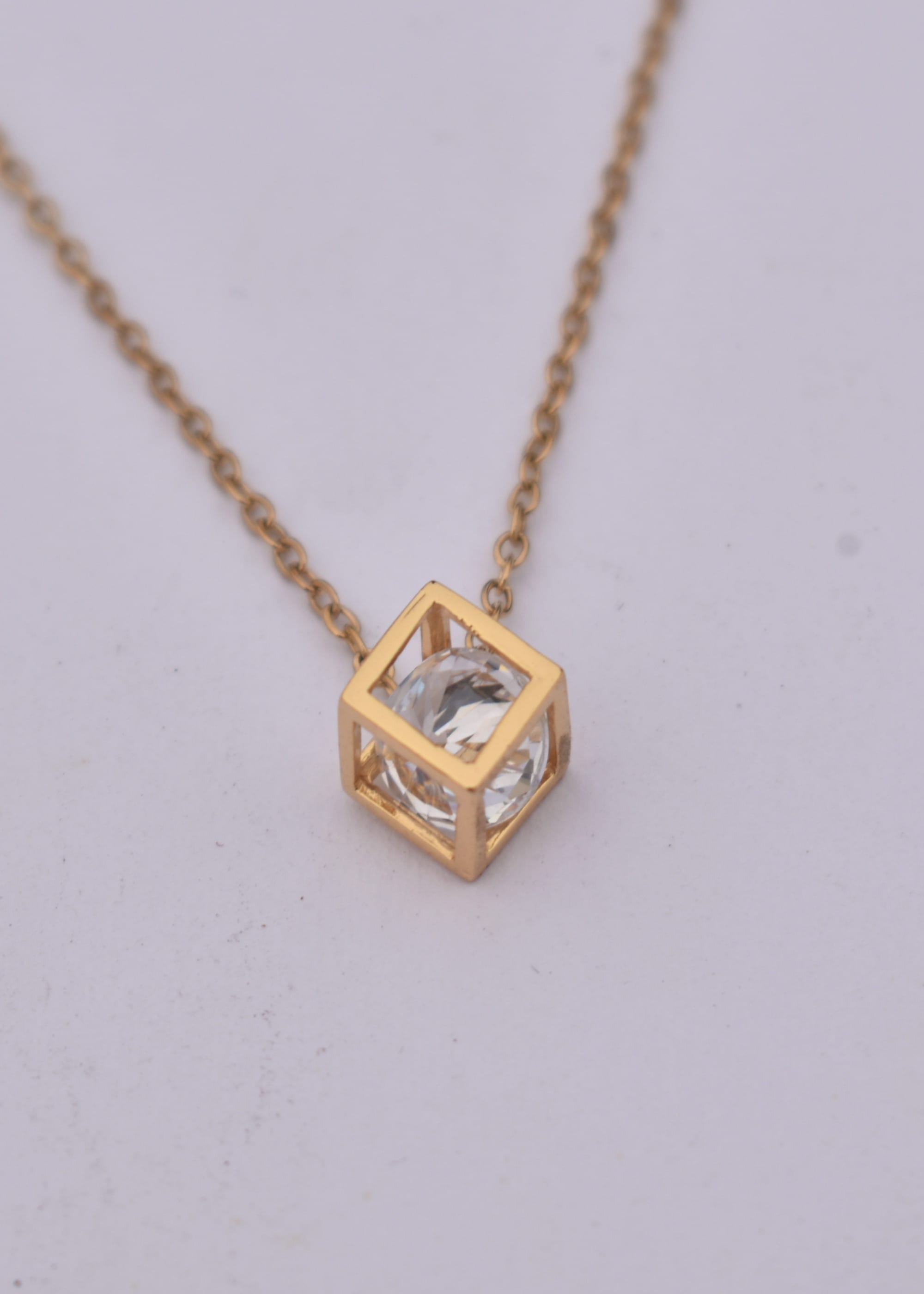 Imagine a stunning necklace plated with radiant gold, featuring a pendant in the shape of a small cube. Inside this exquisite pendant sparkles an artificial diamond, adding a touch of elegance and sophistication.