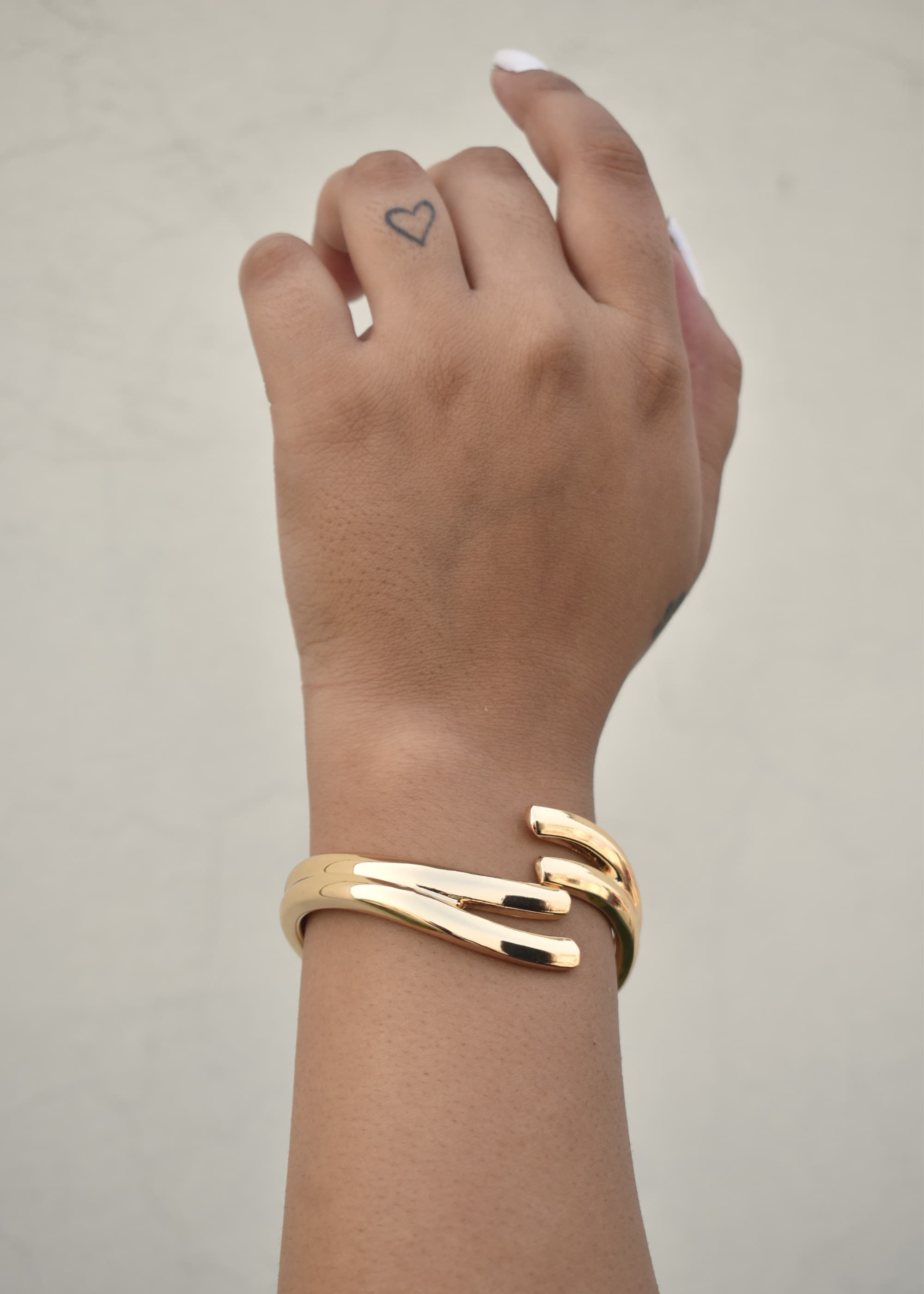 This bracelet is made with a lot of care. It has a unique design where it looks open on one side and splits into two at the ends, giving it a cool and stylish look. You can easily adjust its size to fit your wrist perfectly – just open it up and wrap it around comfortably.