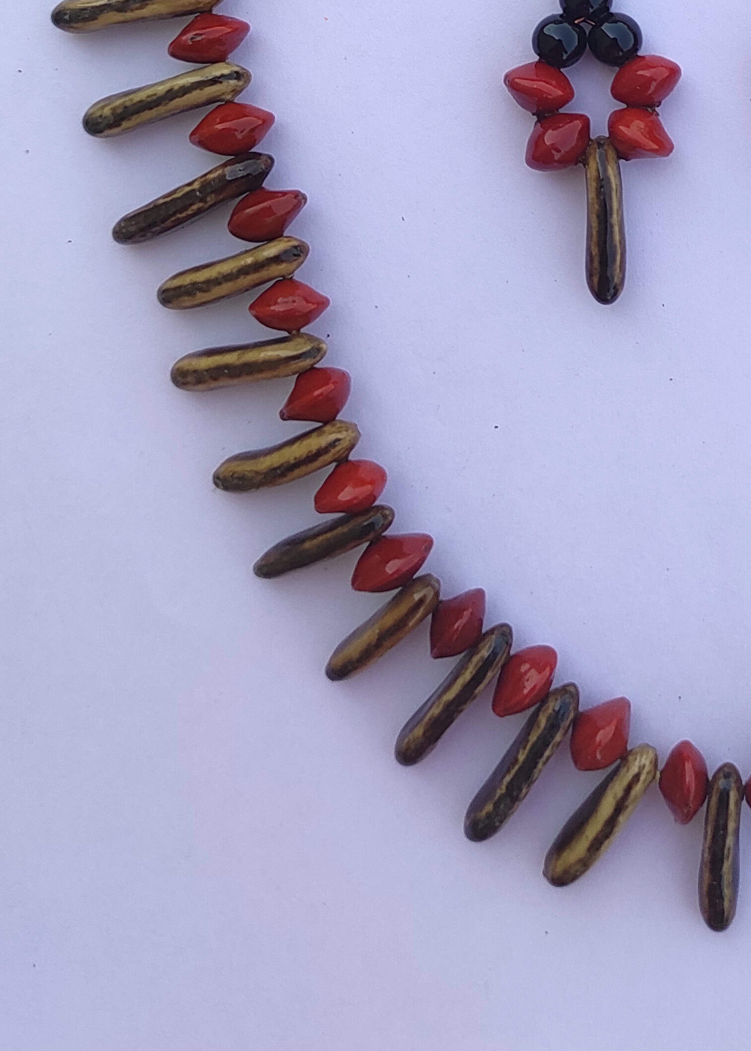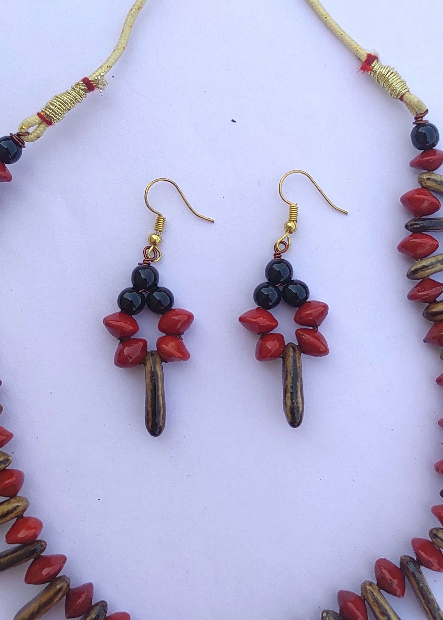 - The necklace and earrings feature a combination of red chandan seeds, brownish long gulmohar seeds, and black ritha seeds.