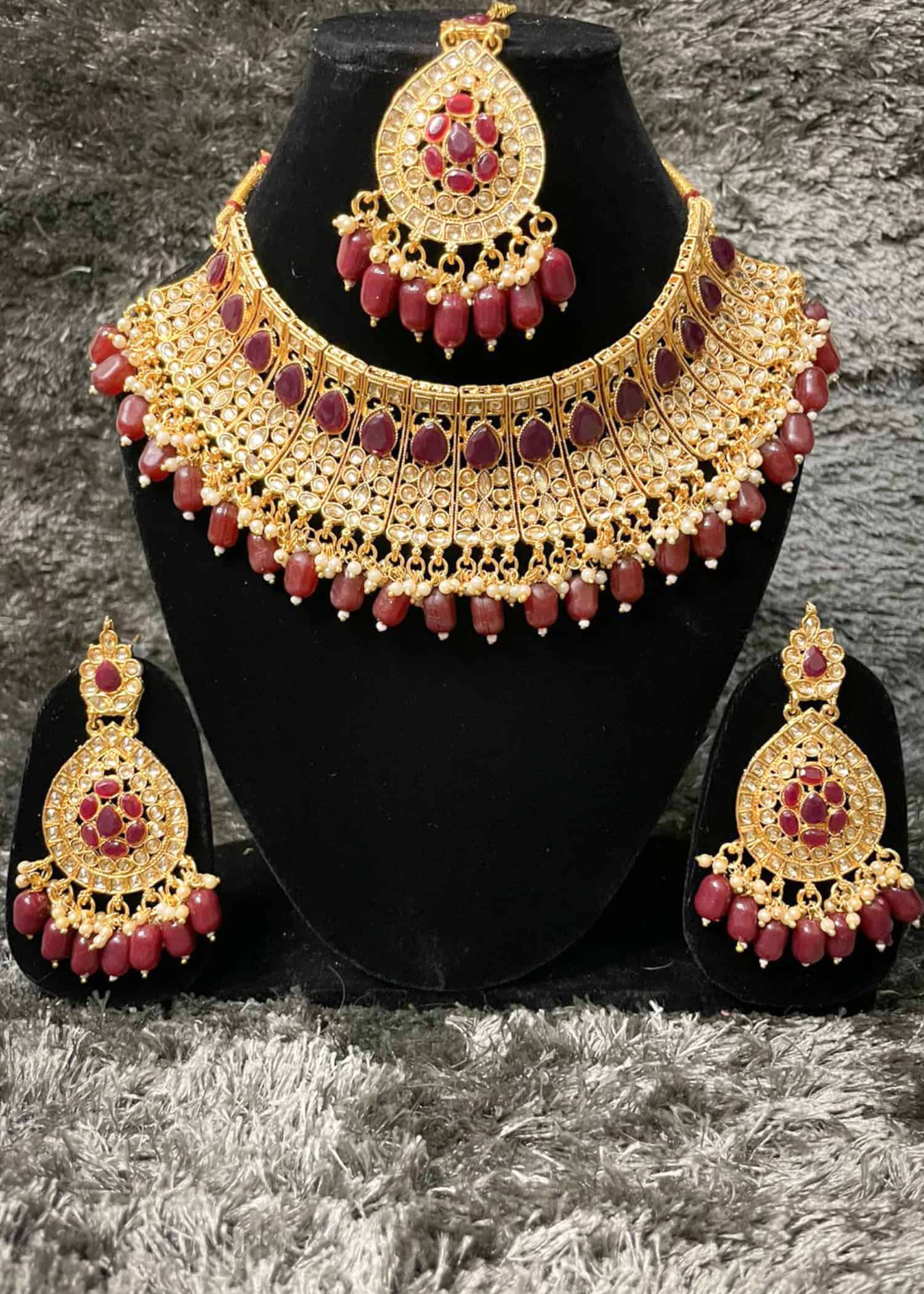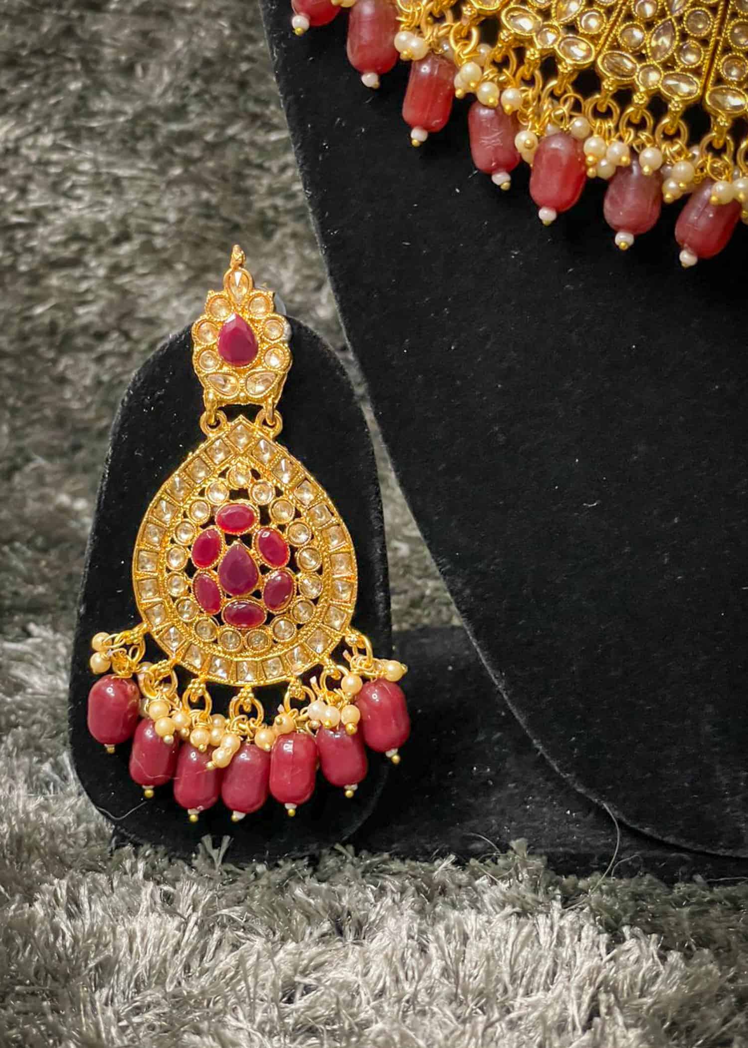 Fashioned from premium gold-plated alloy, this jewelry set showcases some of the finest stone work. Embellished with rich maroon beads and shimmering crystal gemstones that encircle the periphery, it exudes an undeniable aura of royalty that will leave everyone spellbound. The lightweight and flexible design ensures you remain comfortable and confident all day long.