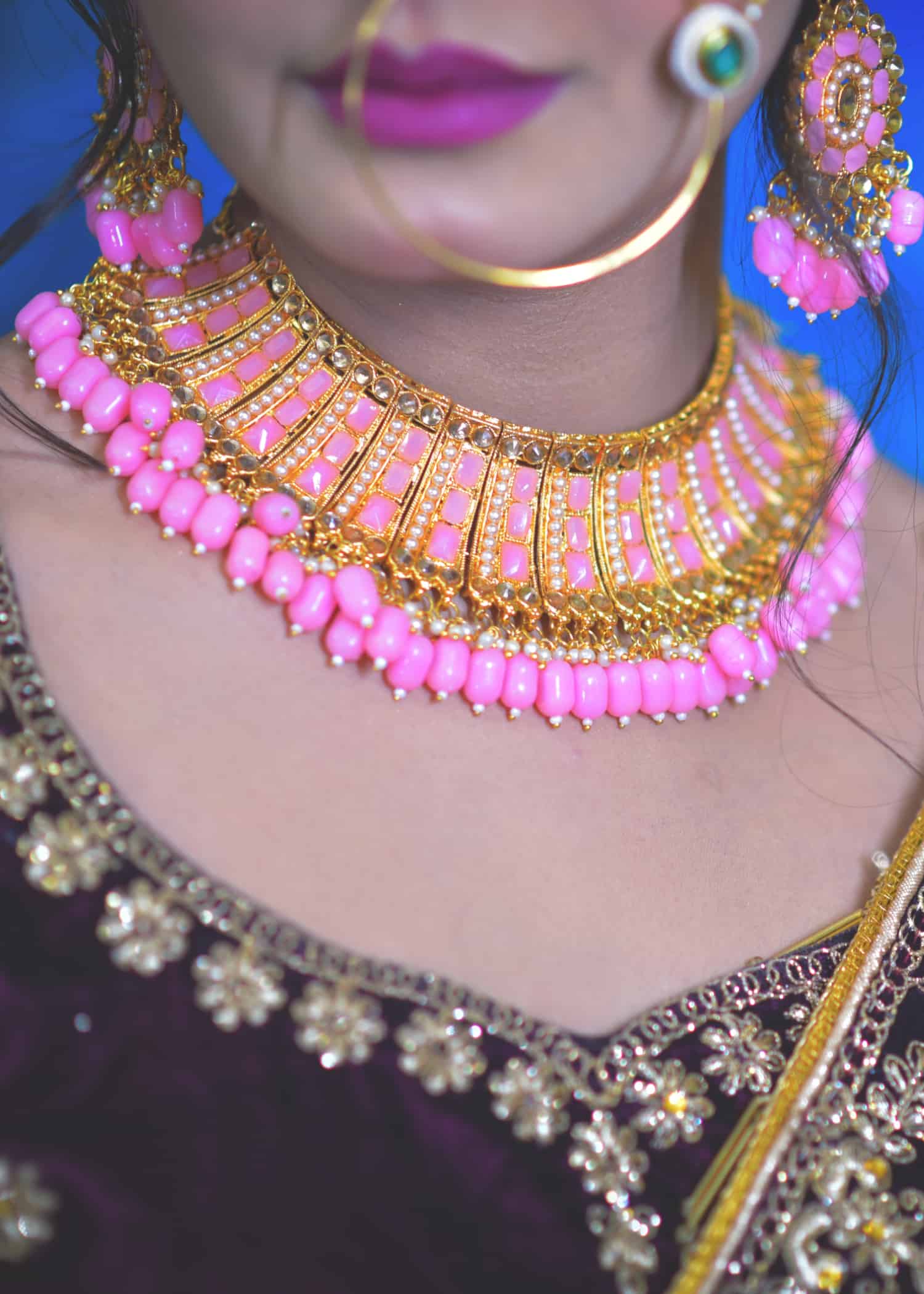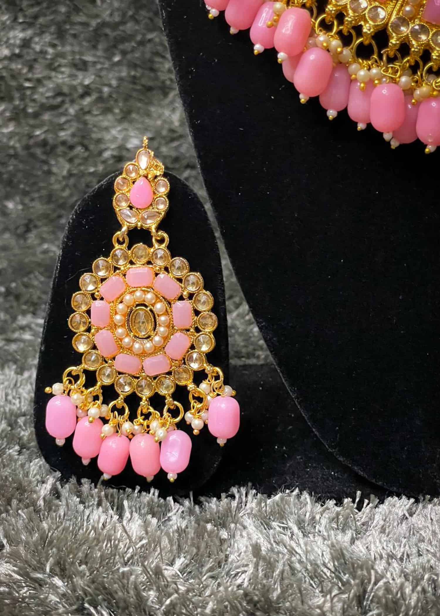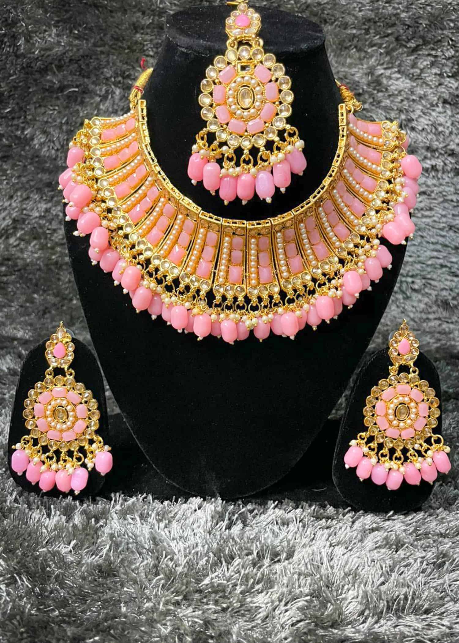 Made of gold plated alloy, this set boasts some of the finest stone work. The choker necklace, maang tikka, and earrings are adorned with pink stones and beads, along with crystal gemstones around the periphery. The intricate design and attention to detail make this jewellery set truly unique and special.