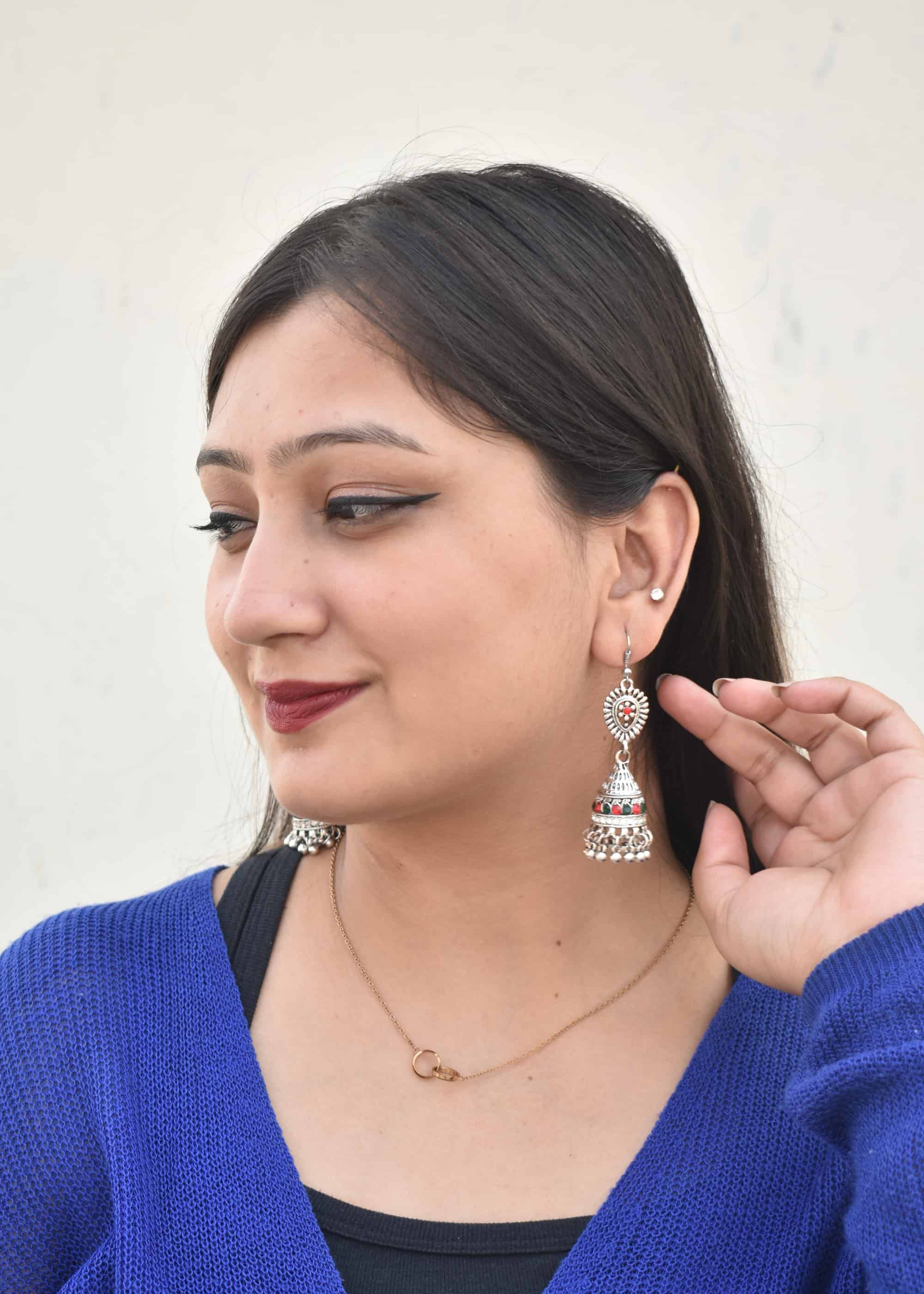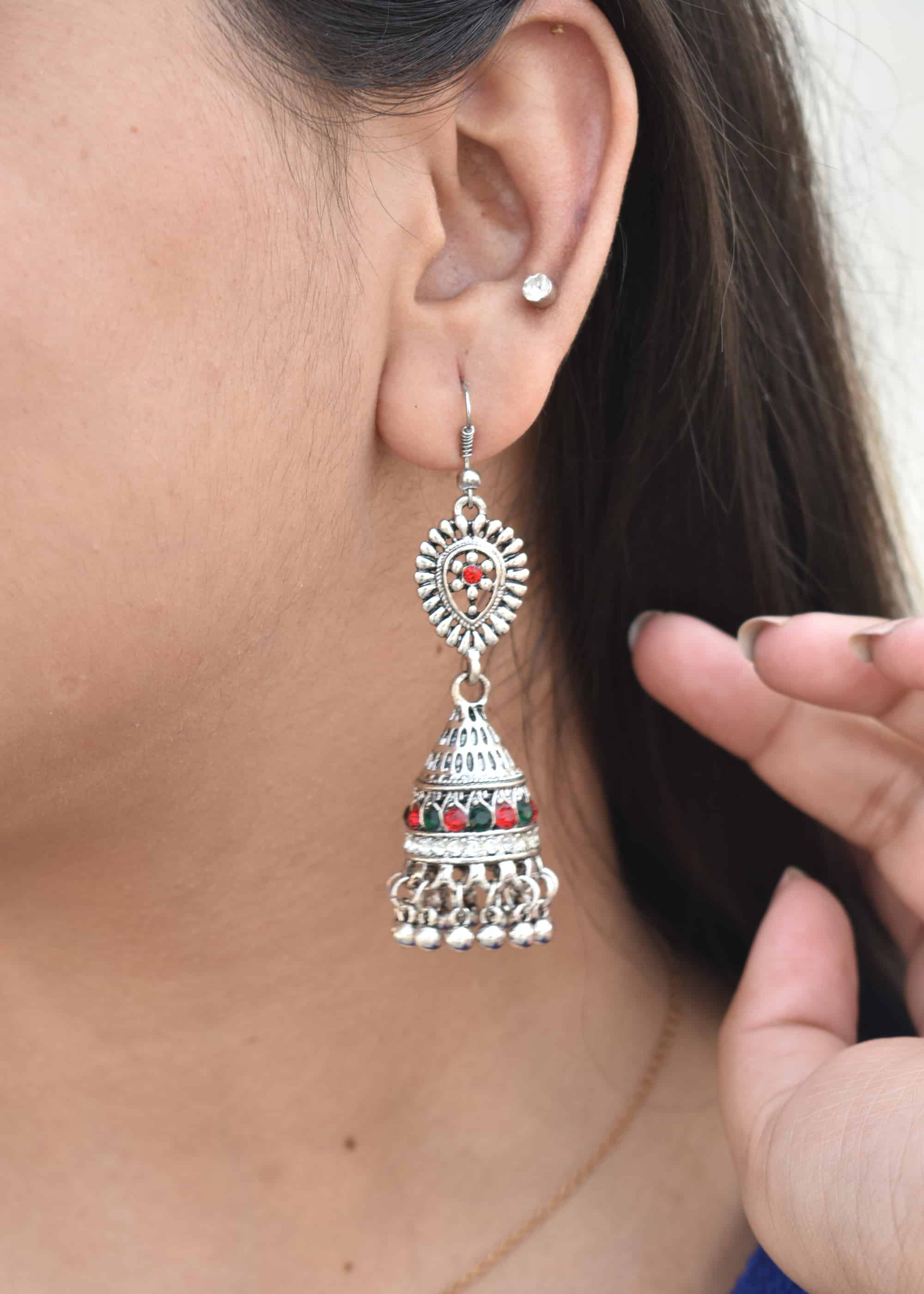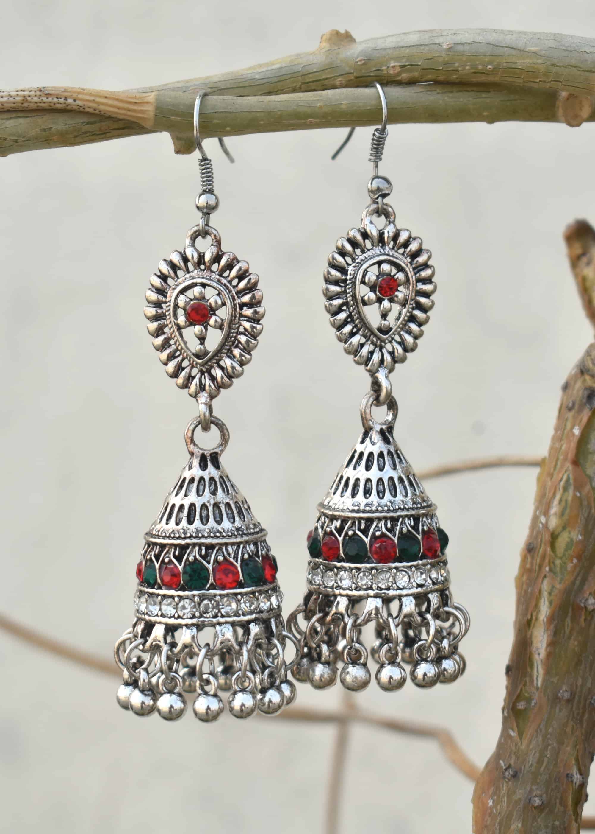 Introducing our beautiful Oxidised Designer Jhumka Earrings from Jaipur – a place famous for making stunning oxidised jewellery. These earrings are special because they’re a mix of silver with a vintage look and colorful gemstones that really pop.