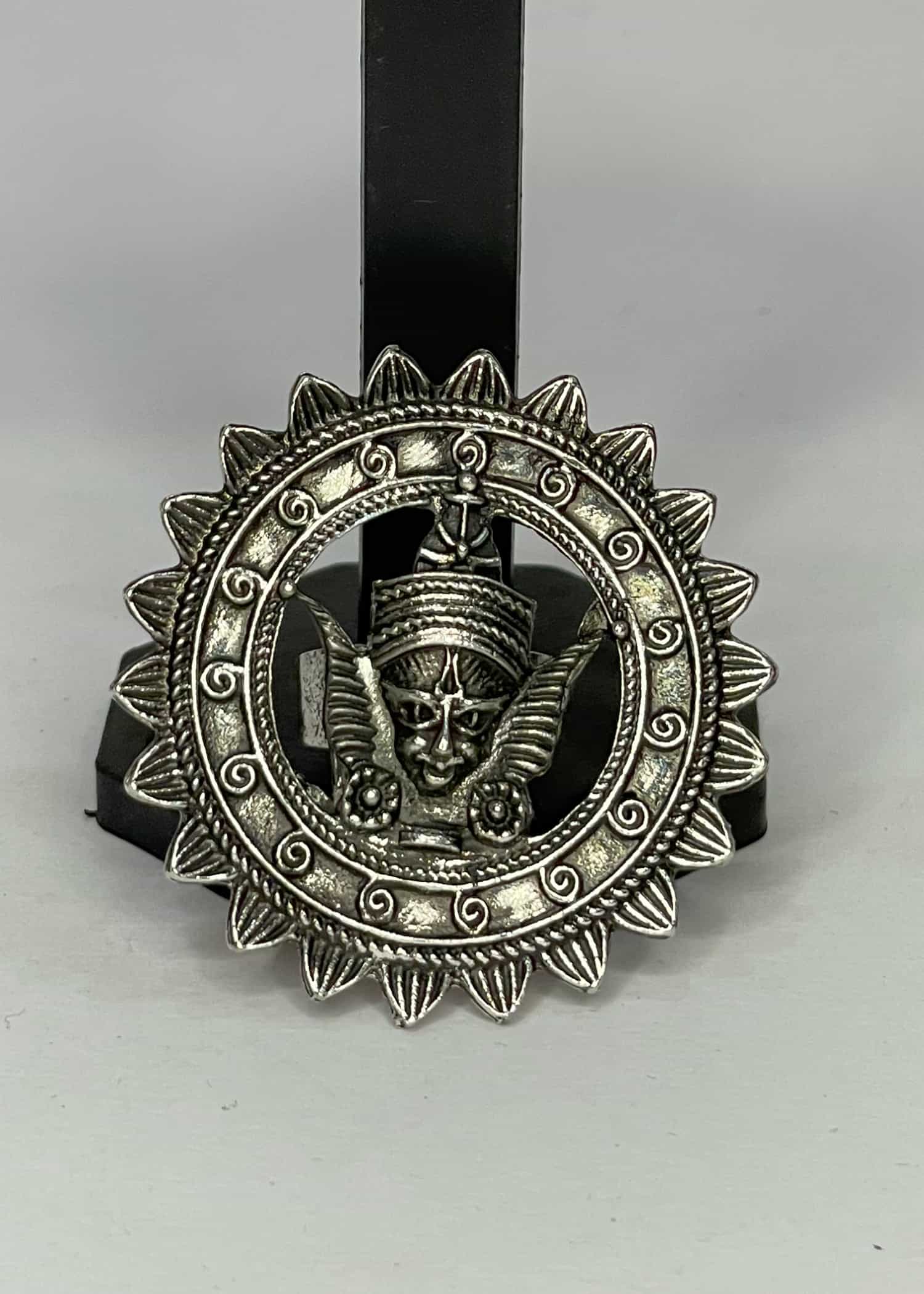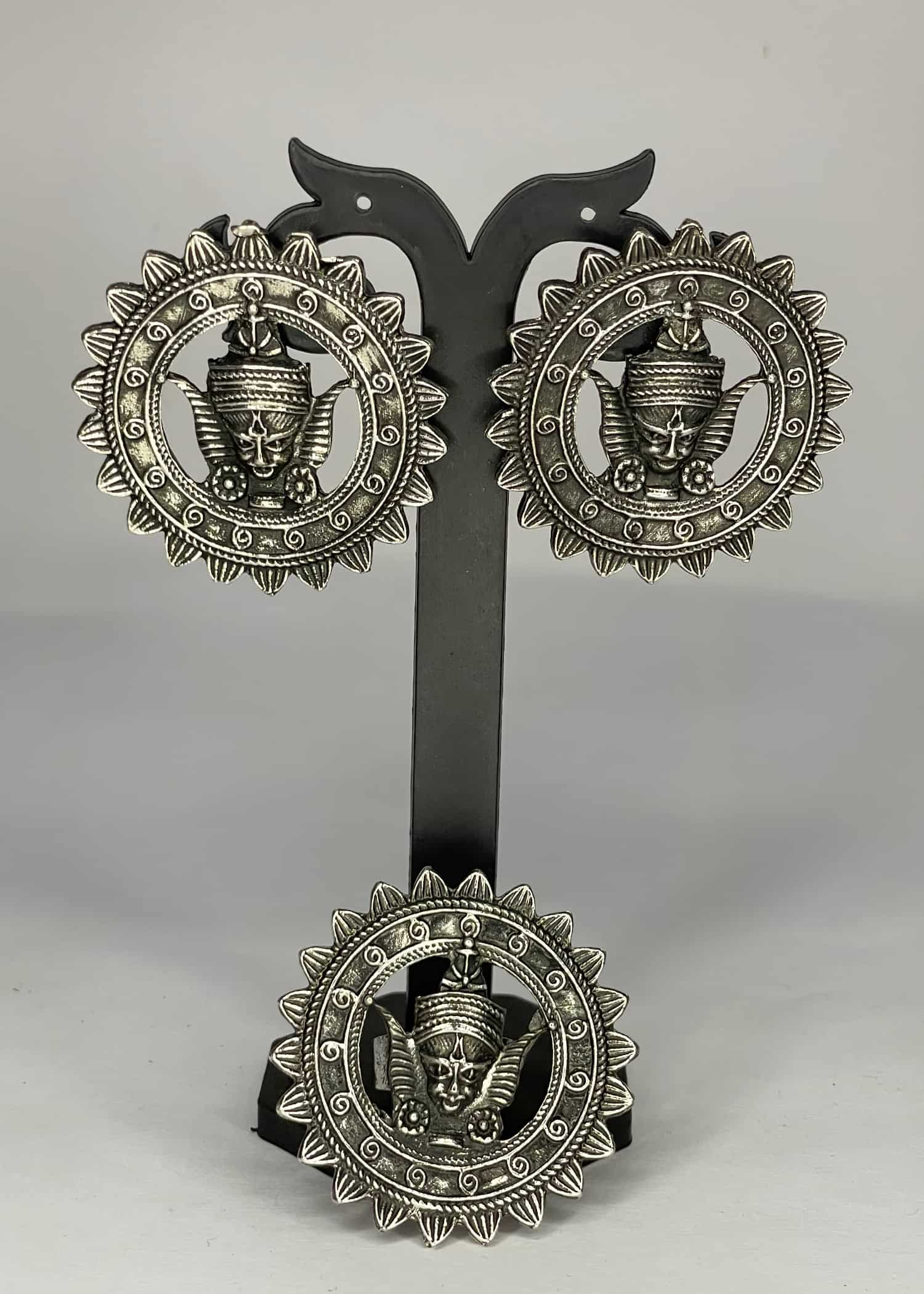 The earrings and finger ring feature a face of a woman inside a circle decorated with beautiful patterns, making them a true statement piece of jewellery. The intricate design is a testament to the craftsmanship and dedication that goes into each piece. The pattern and design of the earrings and finger ring are inspired by traditional Indian jewellery, making them an authentic and timeless addition to any jewellery collection.