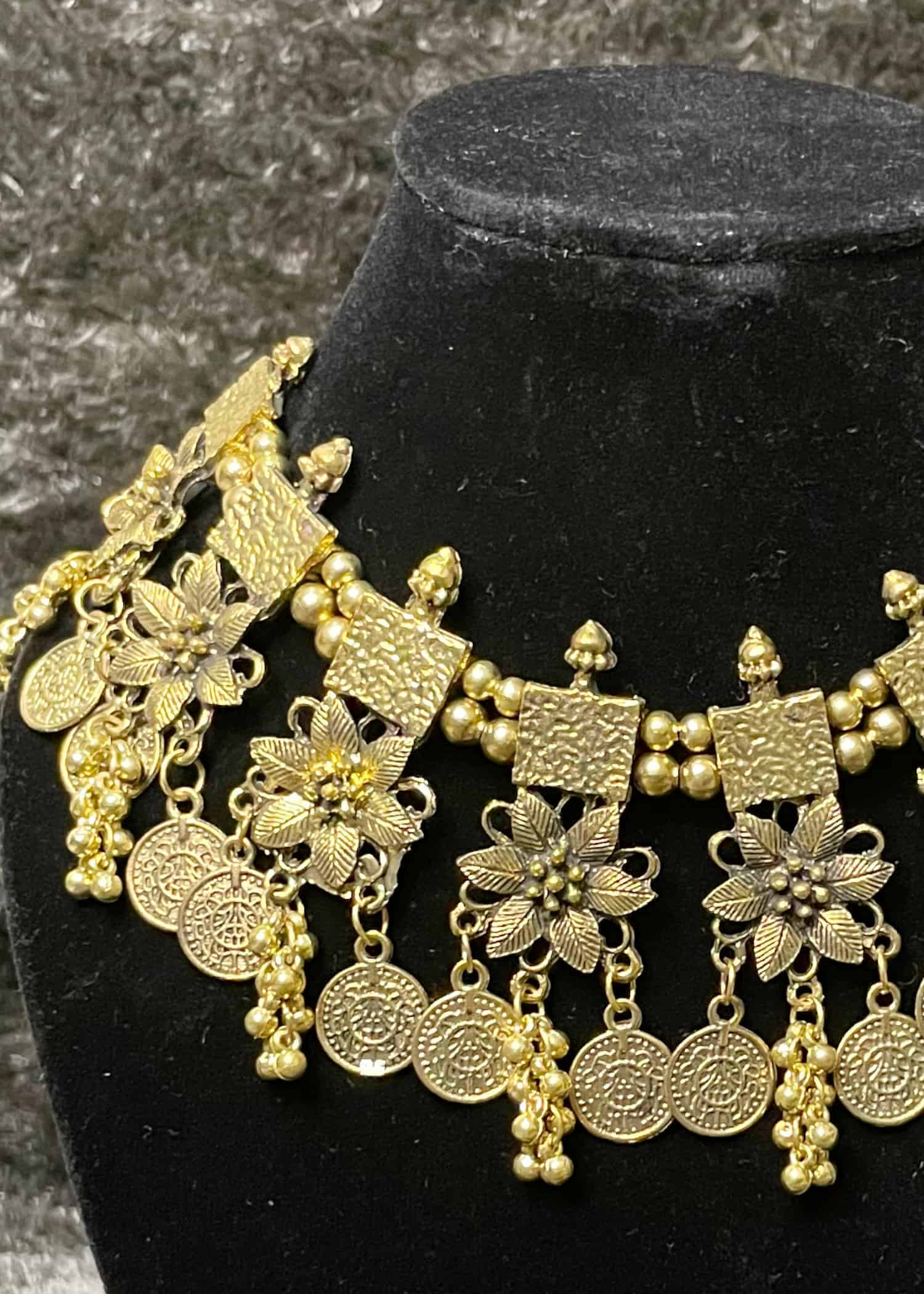 Introducing our exquisite choker necklace inspired by the aura of Pink City – Jaipur. Made with the finest work of oxidized gold plated metal, this necklace is a true masterpiece. The oxidized metal has undergone a chemical process to give it a unique antique look that sets it apart from any other piece of jewellery on the market.