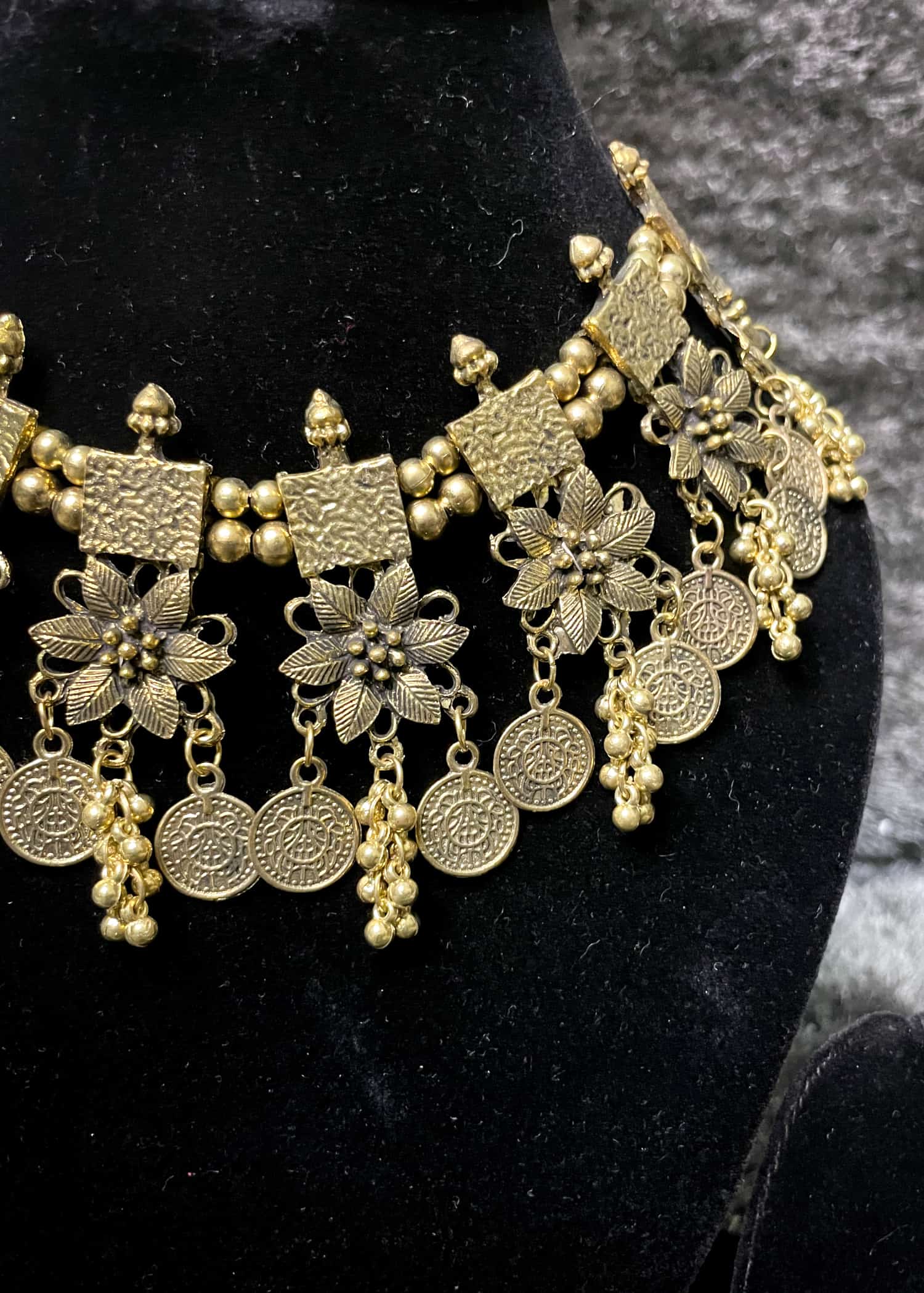 This beautiful necklace features an intricate design with metal flowers and balls that add to its overall elegance. It has a unique antique design that will make you stand out from the crowd. It is perfect for anyone looking to add a touch of tradition to their modern outfit or for those who prefer a more traditional look. The necklace is designed to be lightweight, flexible and easy to wear, making it perfect for daily use or any special occasion.