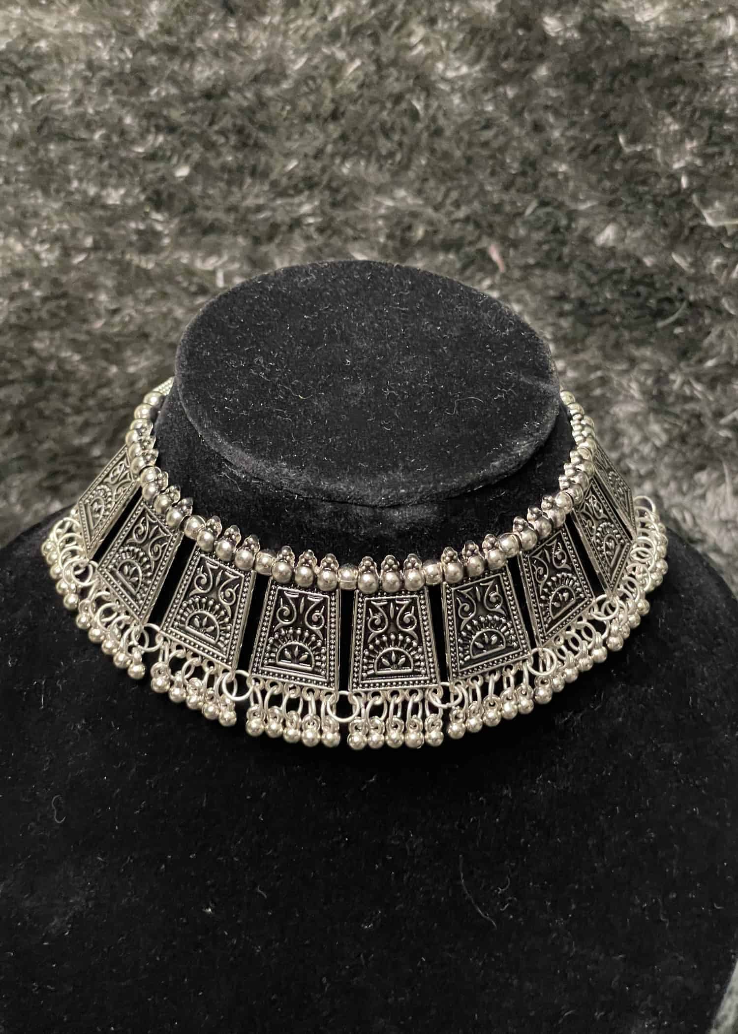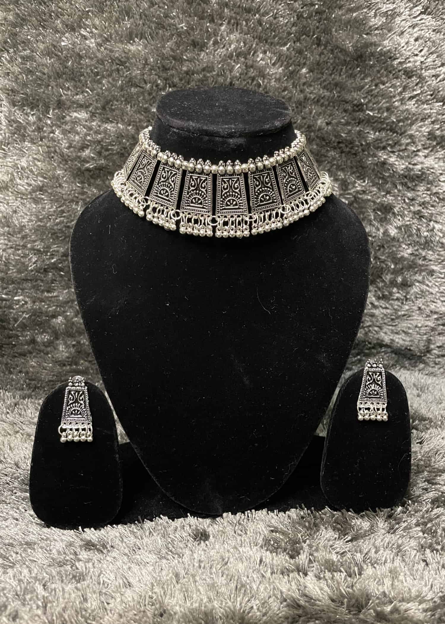 - A stunning set of oxidized jewelry, featuring a choker necklace and a pair of earrings
