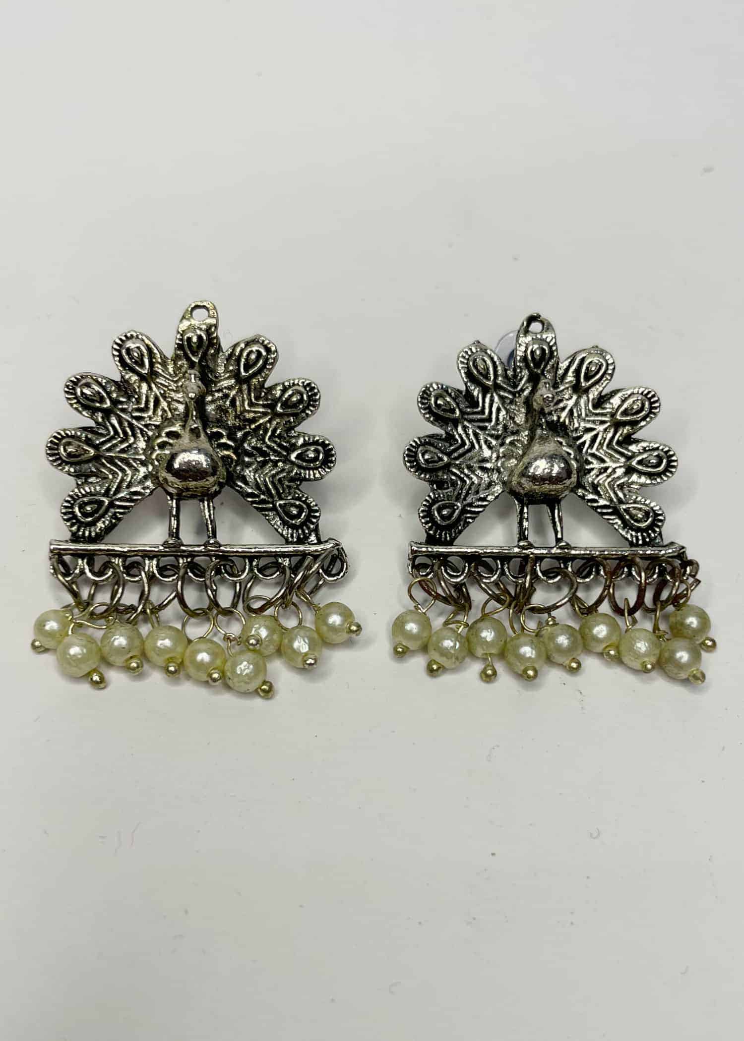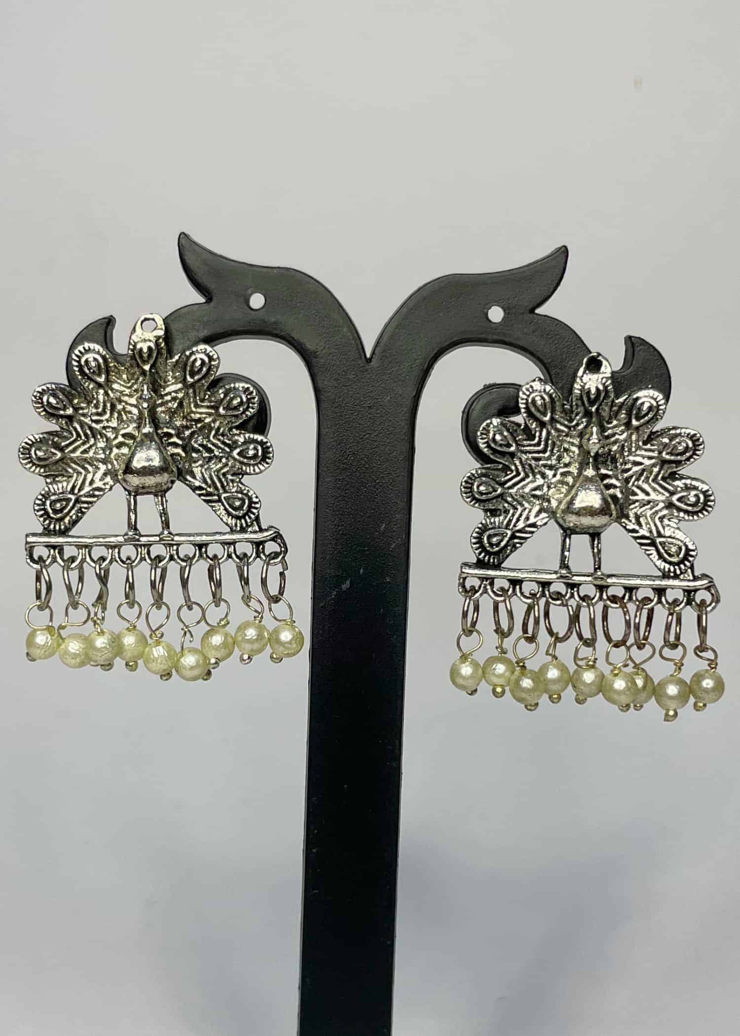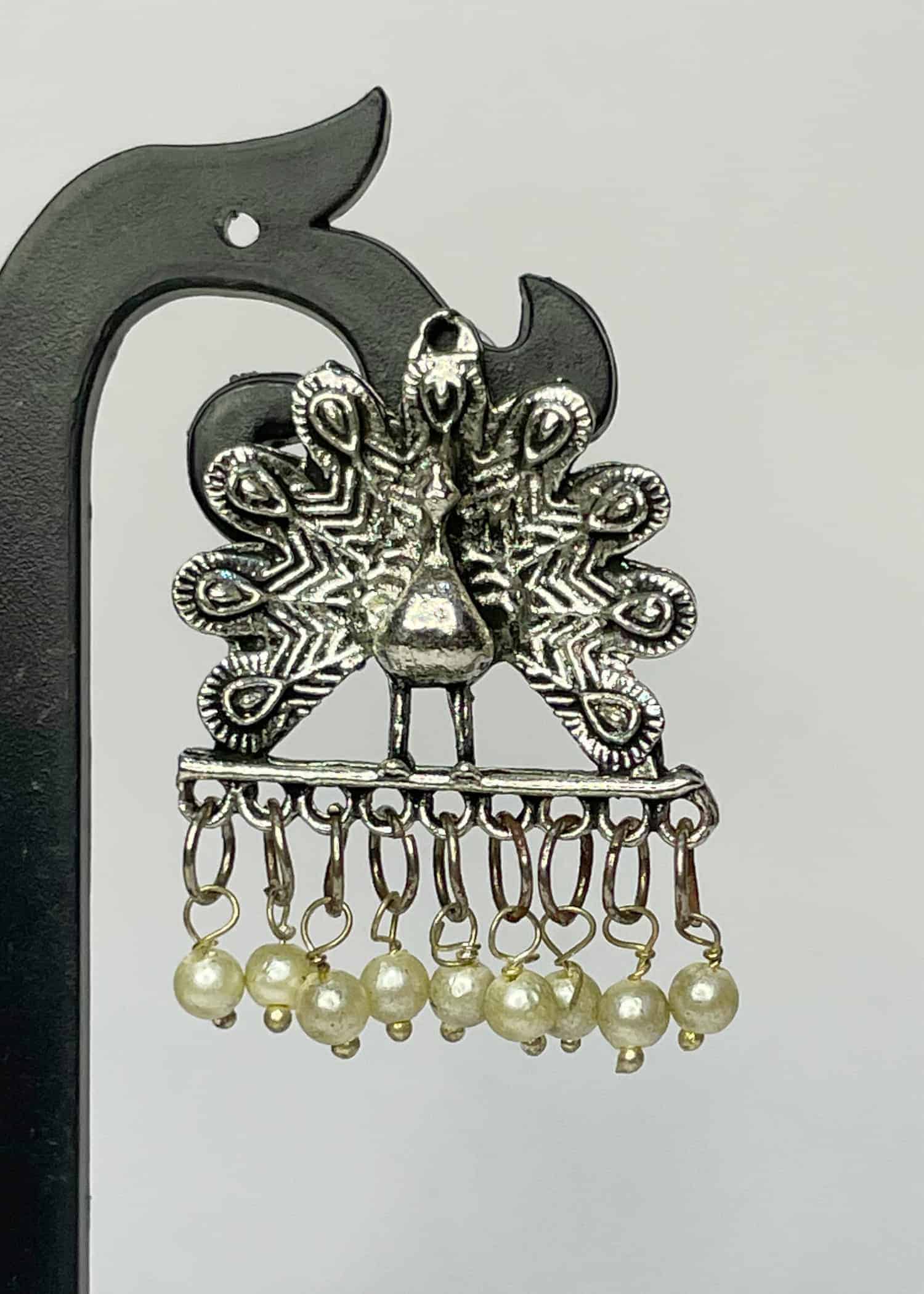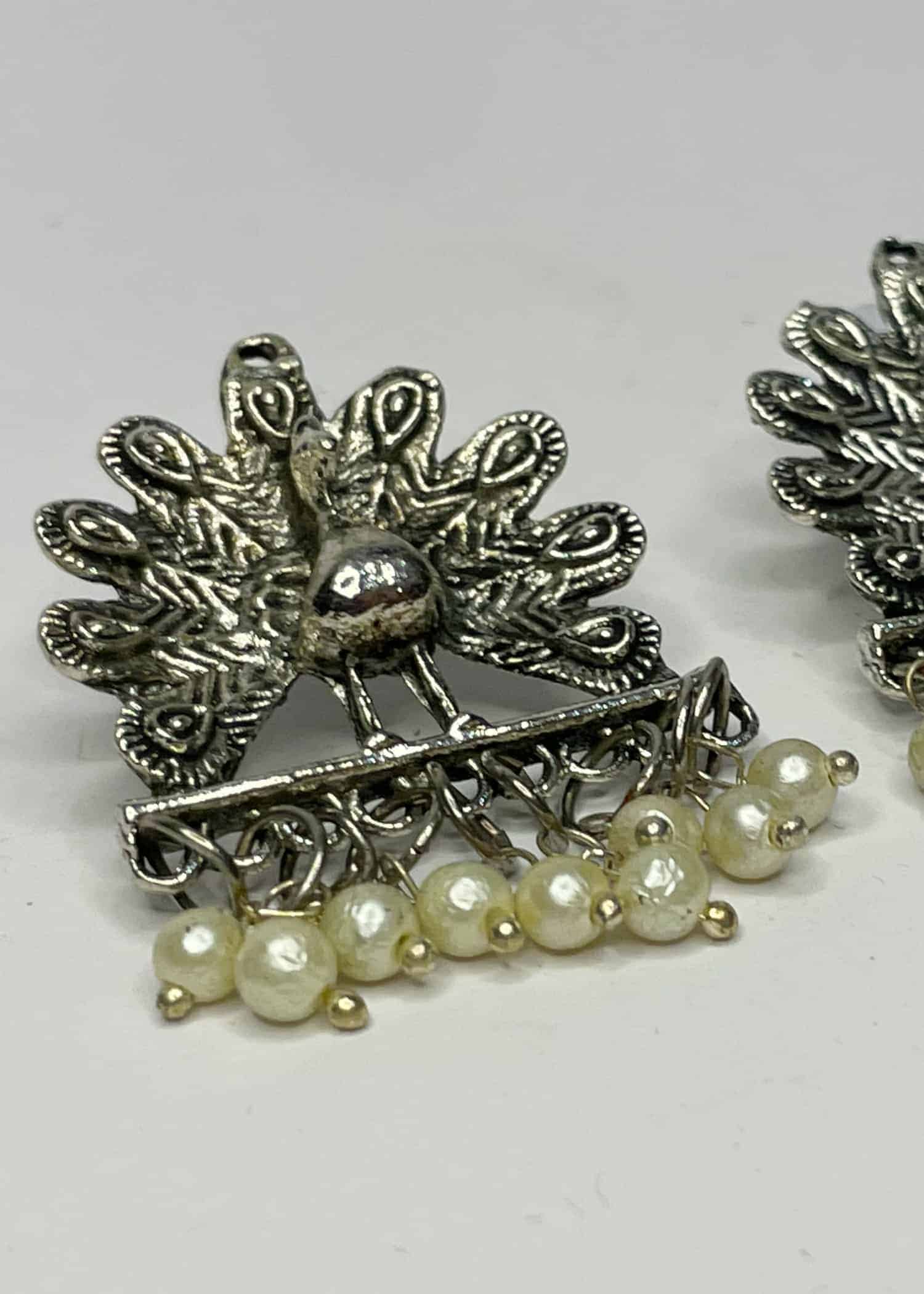 The earrings are designed with a unique peacock motif, with the bird perched on top of a platform from which pearls are hanging. The intricate metalwork and delicate pearls create a beautiful and eye-catching piece that is perfect for women of all ages. Whether dressed up or down, these earrings are sure to become a cherished addition to any jewellery collection.
