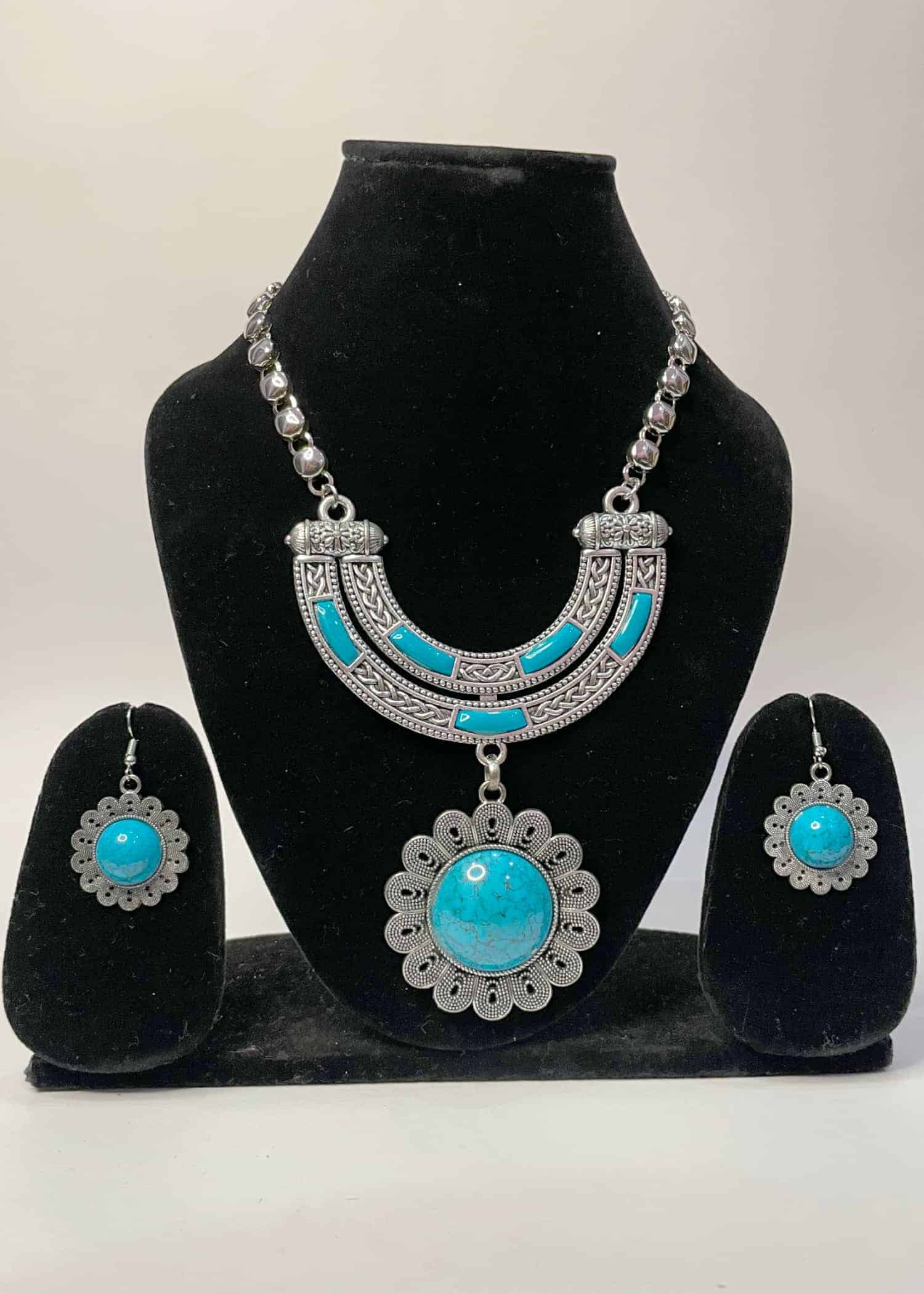 This oxidized jewel set is an exquisite piece of jewellery that consists of a necklace and a pair of earrings. Hailing from the city of Jaipur in India, this set is a testament to the rich tradition of oxidized jewellery making in the region. Oxidized jewellery is created by treating metal with chemical compounds to give it an antique, oxidized finish that adds character and depth to the piece.