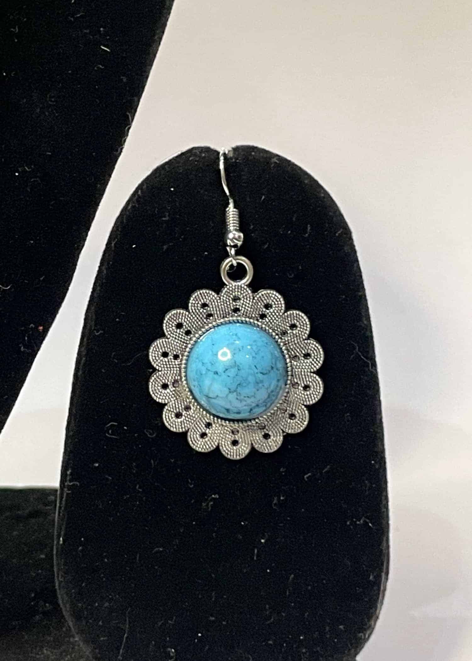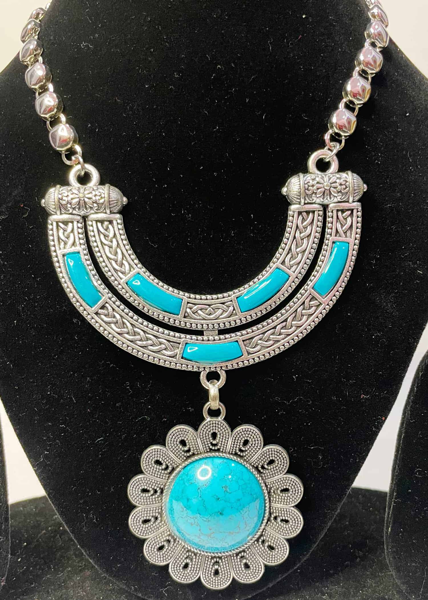 The highlight of this set is the beautiful hemispherical blue stones that adorn the necklace and earrings. These stones are intricately textured to add an element of depth and dimension to the design. The textures lend the stones a unique look that will set you apart from the crowd.