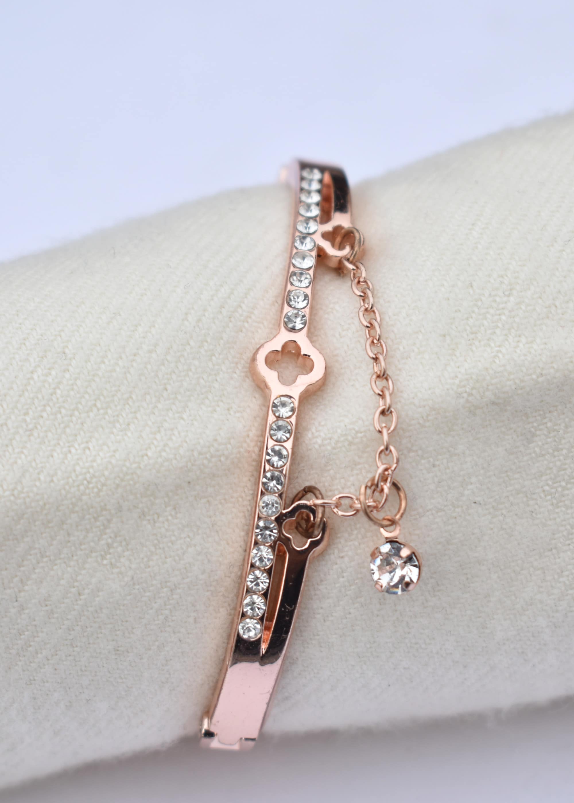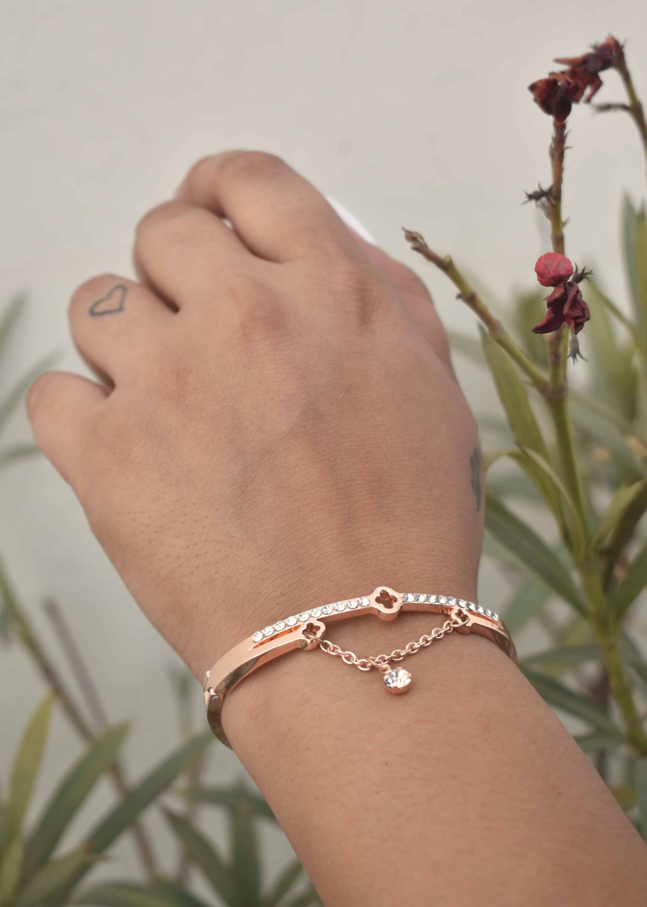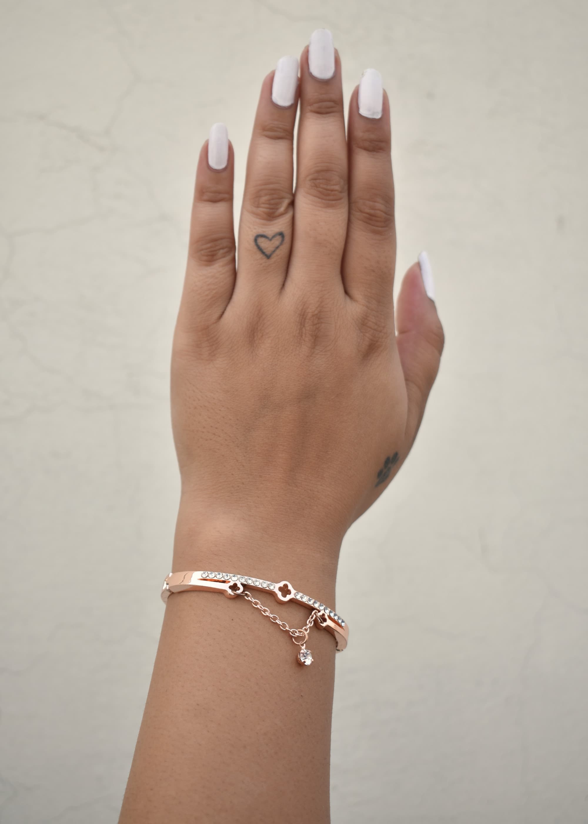 Imagine a cute bracelet with a special 4-leaf design in the middle. On each side, there are these sparkly clear gemstones that catch the light and make you look like a star. Plus, there’s this one gemstone hanging from a tiny chain that adds a little extra charm.
