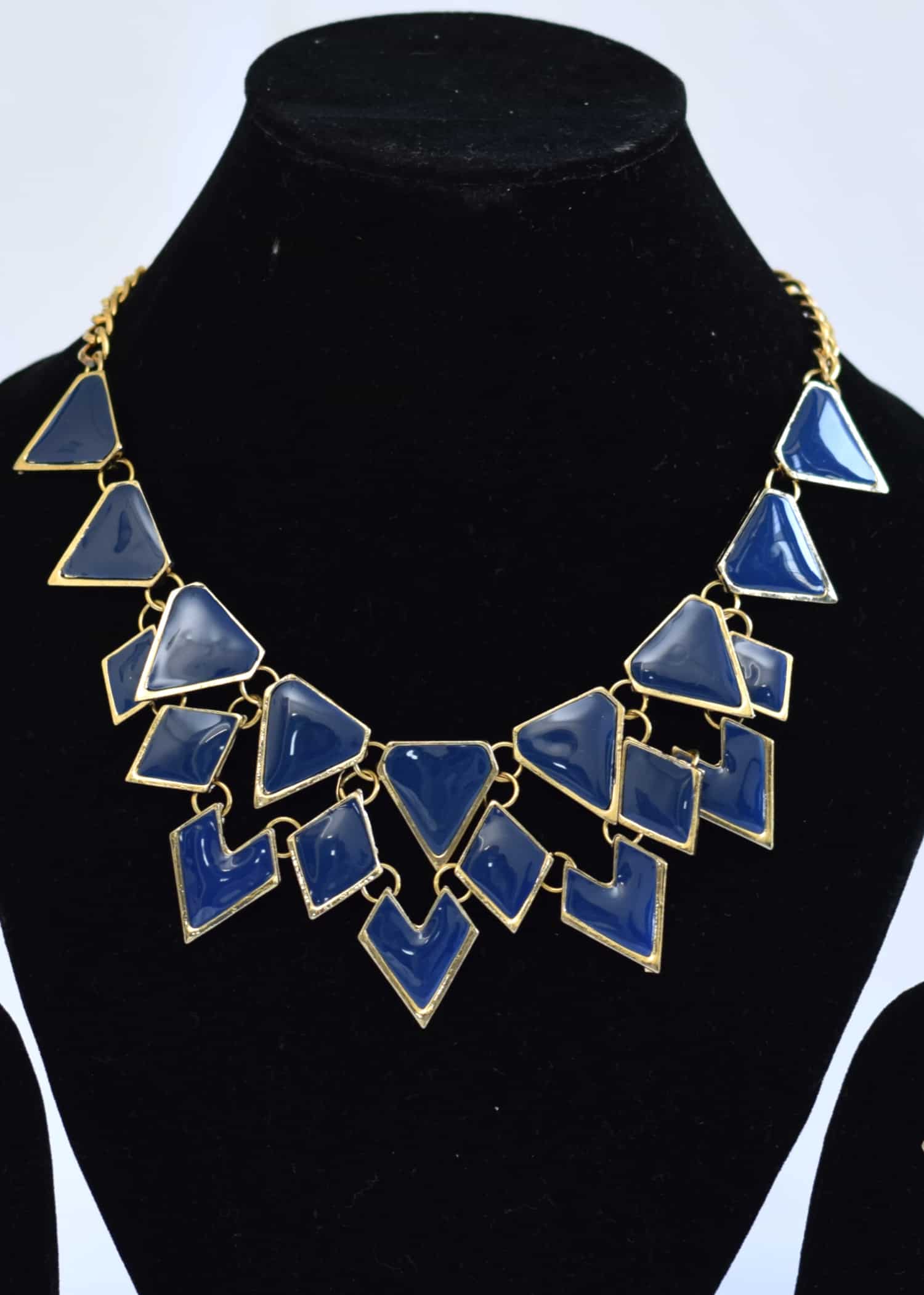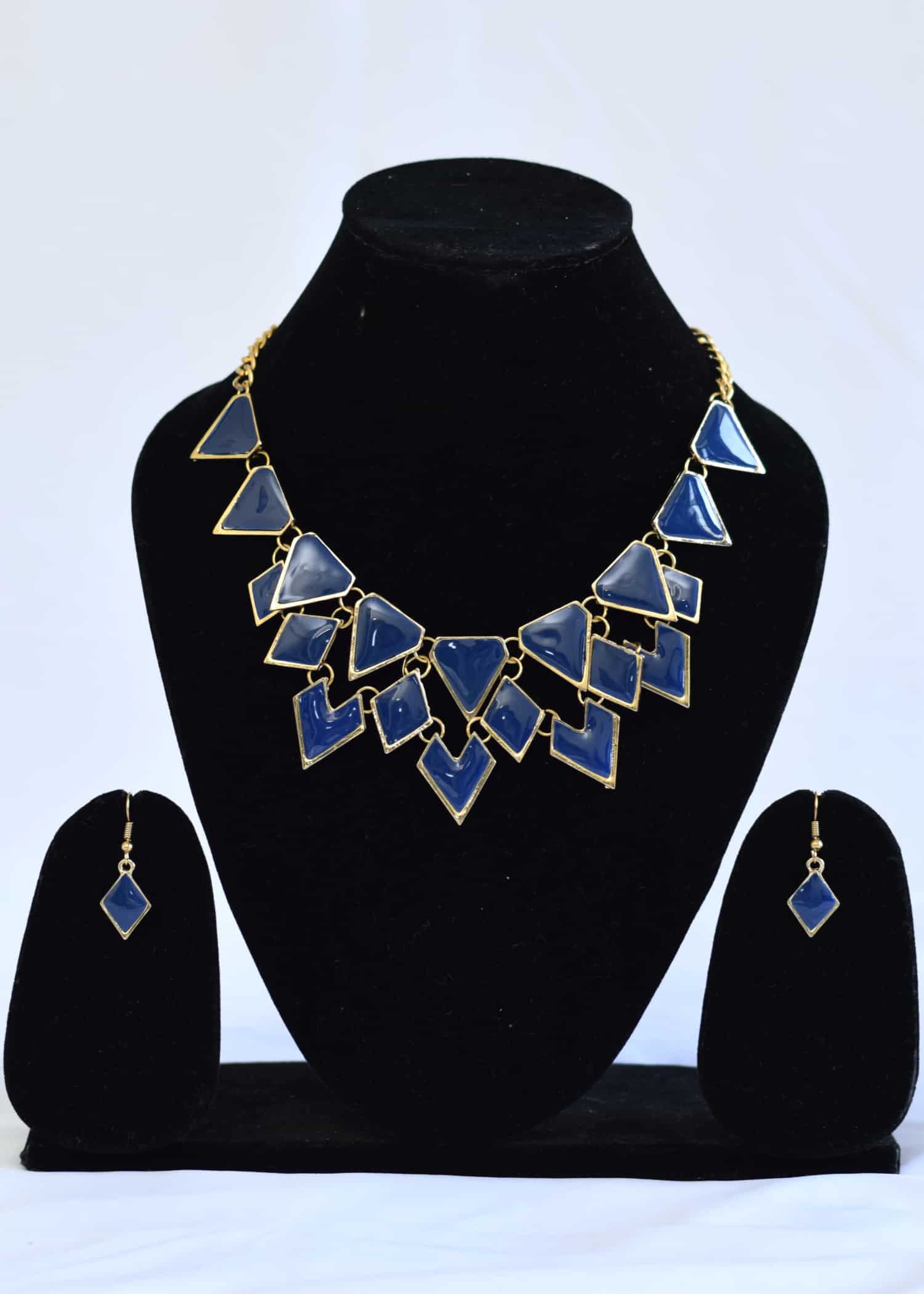 In conclusion, if you are looking for a stylish and elegant jewellery set that can be worn for any occasion, this metal jewellery set with blue triangular gemstones is an excellent choice.