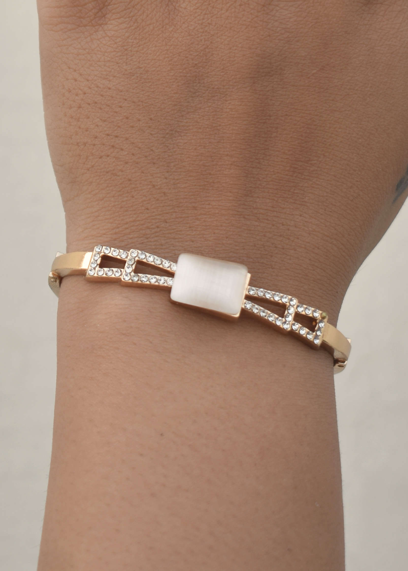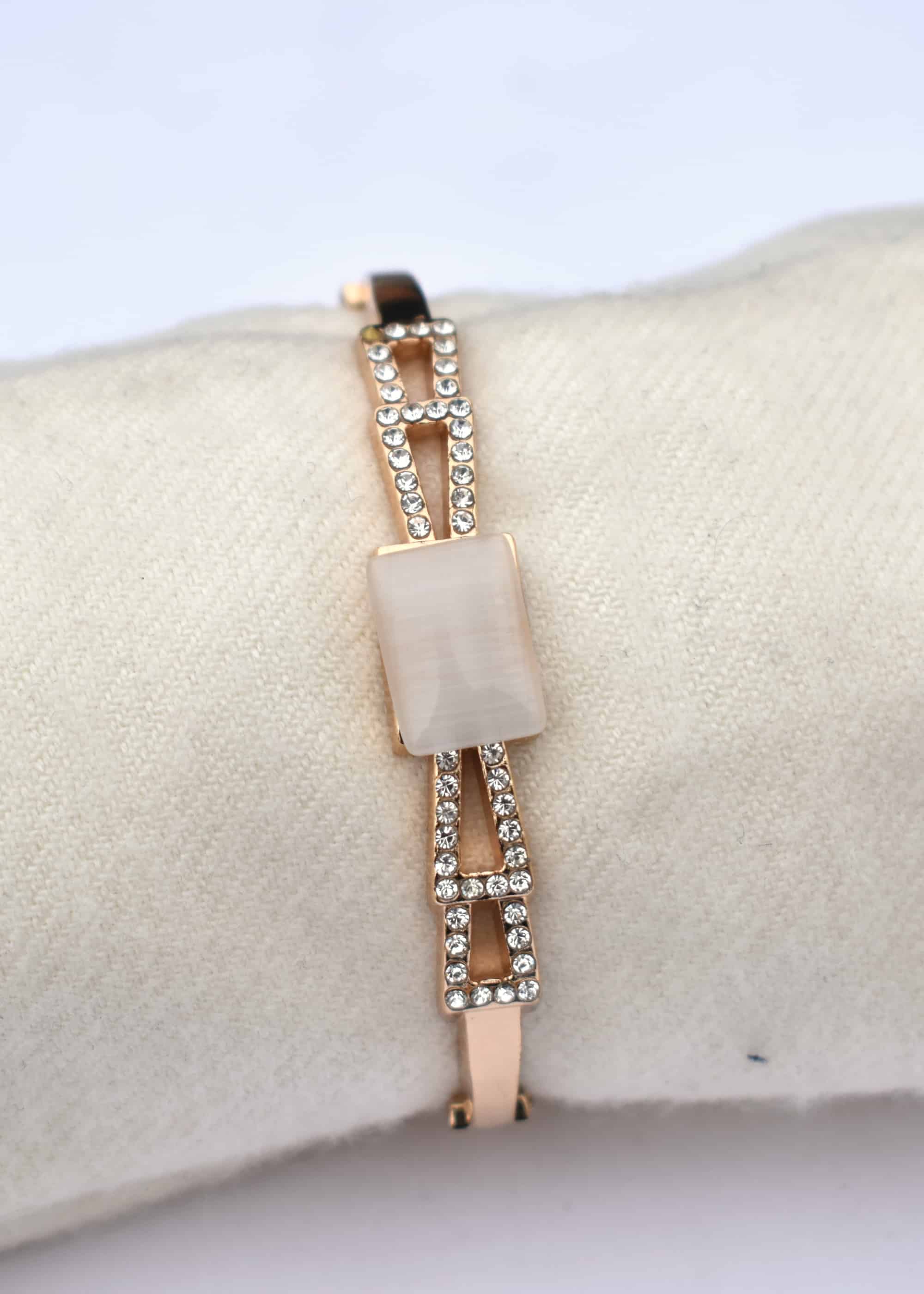 Introducing our exquisite Twinkling Rose Gold Bracelet – a piece of jewellery that seamlessly blends sophistication with modern charm. This stunning bracelet features a prominent white rectangular gemstone at its center, surrounded by delicate wings adorned with beautiful clear gemstones on either side.